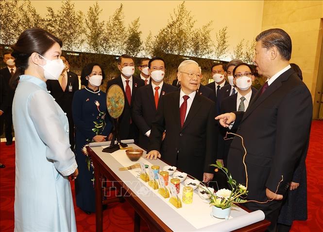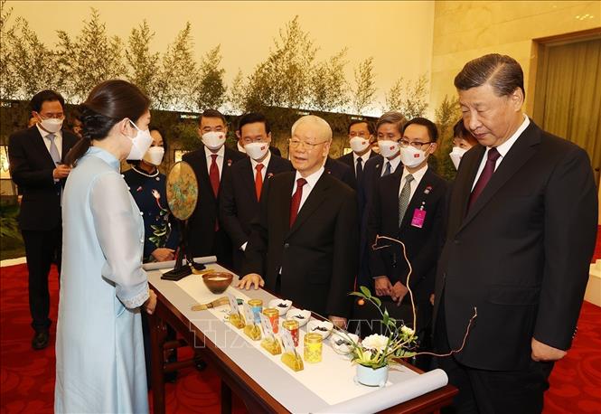 Tổng Bí thư Nguyễn Phú Trọng và Tổng Bí thư, Chủ tịch Trung Quốc Tập Cận Bình nghe giới thiệu trà đạo