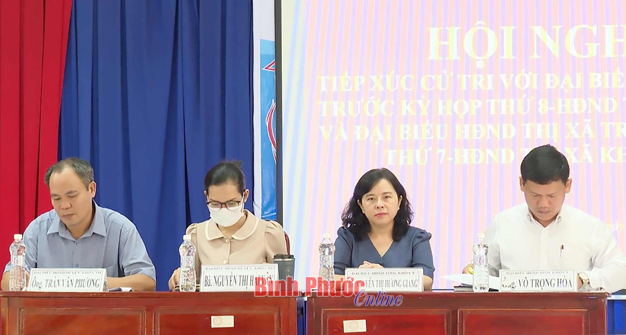 Cử tri cũng có nhiều ý kiến, kiến nghị liên quan đến các vấn đề: Sớm giao giấy chứng nhận quyền sử dụng đất cho người dân ở khu vực tái định cư dự án Khu công nghiệp Becamex - Bình Phước; nâng cấp sửa chữa tuyến ĐH07; đầu tư thêm và vận hành đèn cao áp ở ngã ba mũi dùi (khu vực giao nhau giữa đường Hồ Chí Minh với tuyến ĐT751) để hạn chế tai nạn giao thông; đẩy nhanh tiến độ làm kênh thoát nước giáp ranh với dự án Khu công nghiệp Becamex - Bình Phước; có chế độ phụ cấp cho tổ an ninh nhân dân khu dân cư…