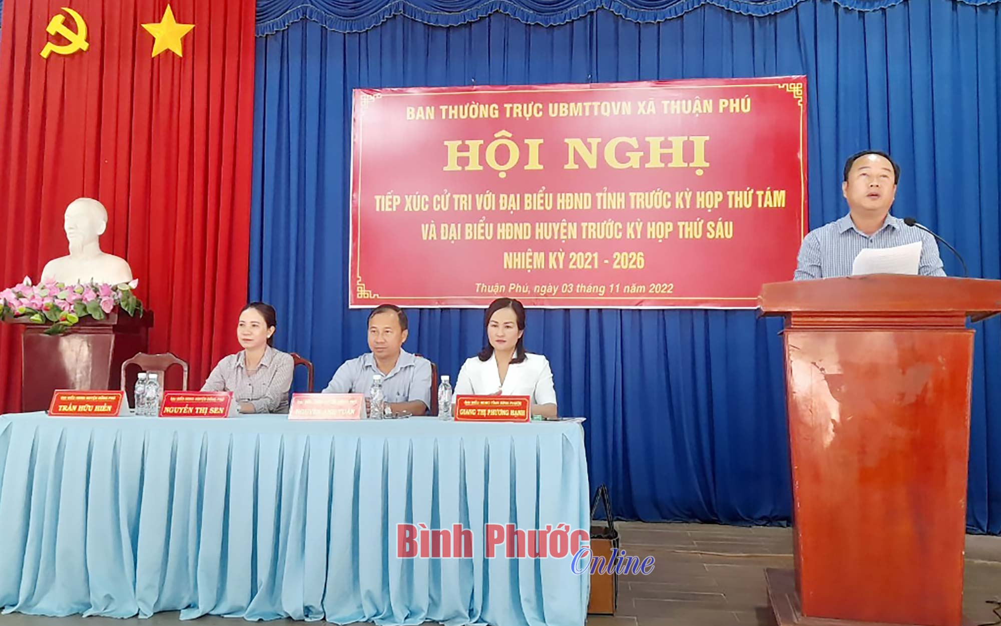 Sau khi nghe đại biểu HĐND 2 cấp thông báo dự kiến nội dung, chương trình, thời gian tổ chức các kỳ họp sắp tới của HĐND tỉnh, huyện và kết quả giải quyết ý kiến, kiến nghị của cử tri trong đợt tiếp xúc trước, cử tri xã Thuận Phú đã có 5 lượt ý kiến, kiến nghị xoay quanh các nội dung: Hiện nay, khi vay vốn ngân hàng, người dân vẫn phải mua bảo hiểm tiền gửi; vì sao cùng một tuyến đường nhưng có hộ được lên thổ cư, hộ thì không; dải phân cách tuyến ĐT741 qua địa bàn quá dài, cần mở thêm các nút qua đường để thuận tiên cho người dân trong đi lại. Tuyến đường từ trung tâm xã vào ấp Tân Phú xuống cấp, cần được khắc phục...