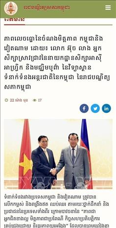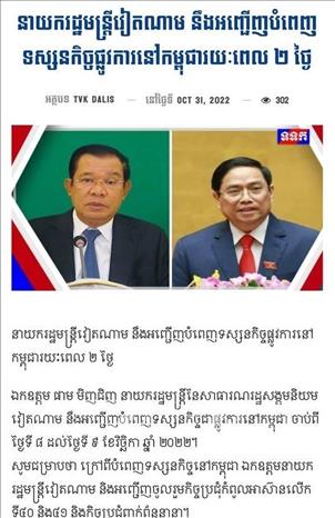 Trong hai ngày 4 và 5-11, trang tin điện tử swiftnews và trang chủ của Viện Hàn Lâm Hoàng Gia Campuchia (RAC) đăng bài phân tích chuyên sâu của học giả Uch Leang, Phó Vụ trưởng Vụ Nghiên cứu Á - Phi và Trung Đông, Viện Quan hệ Quốc tế Campuchia (RAC), về chuyến thăm Campuchia tới đây của Thủ tướng Phạm Minh Chính với tiêu đề “Điểm nhấn của tình hữu nghị Campuchia - Việt Nam”.