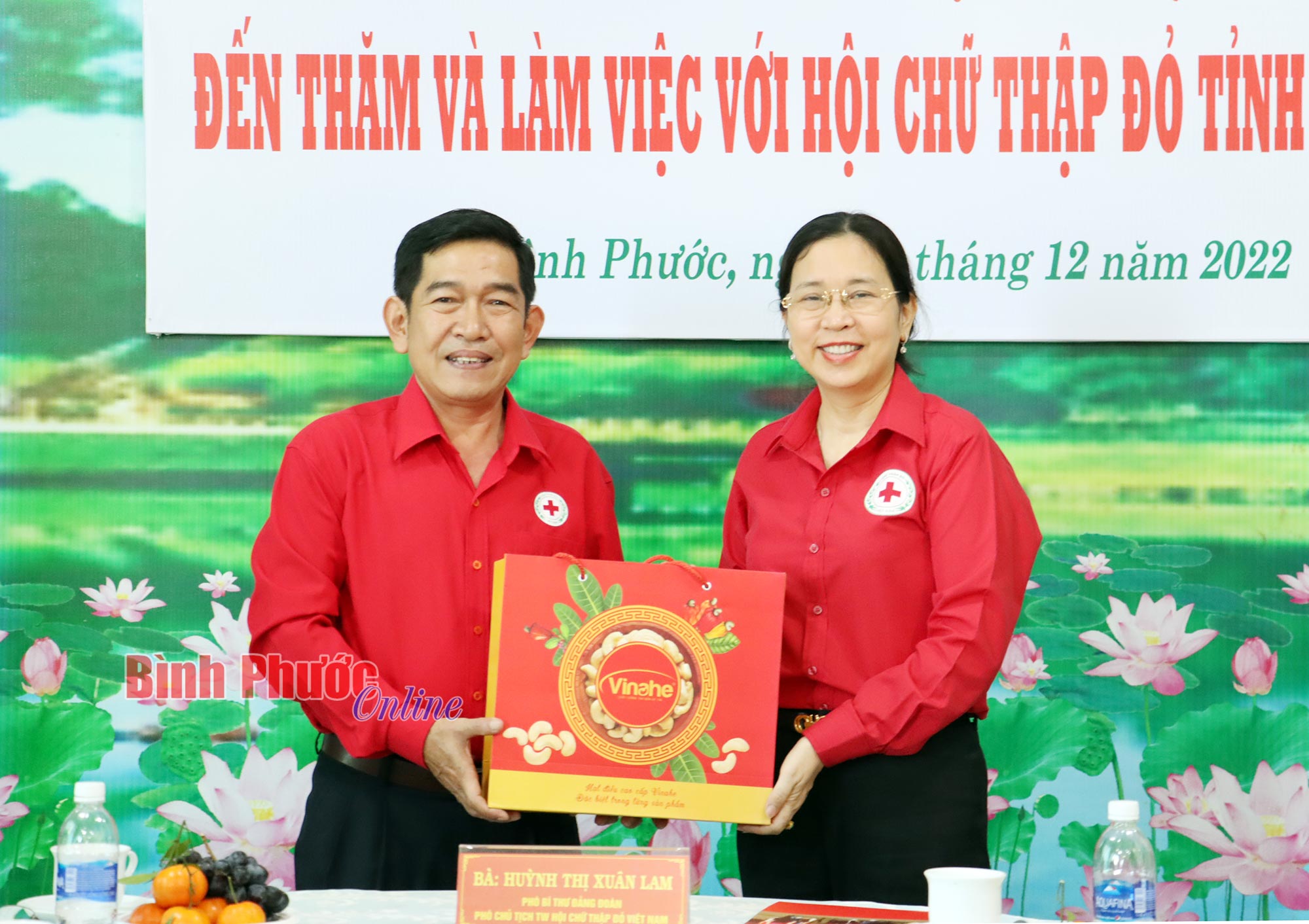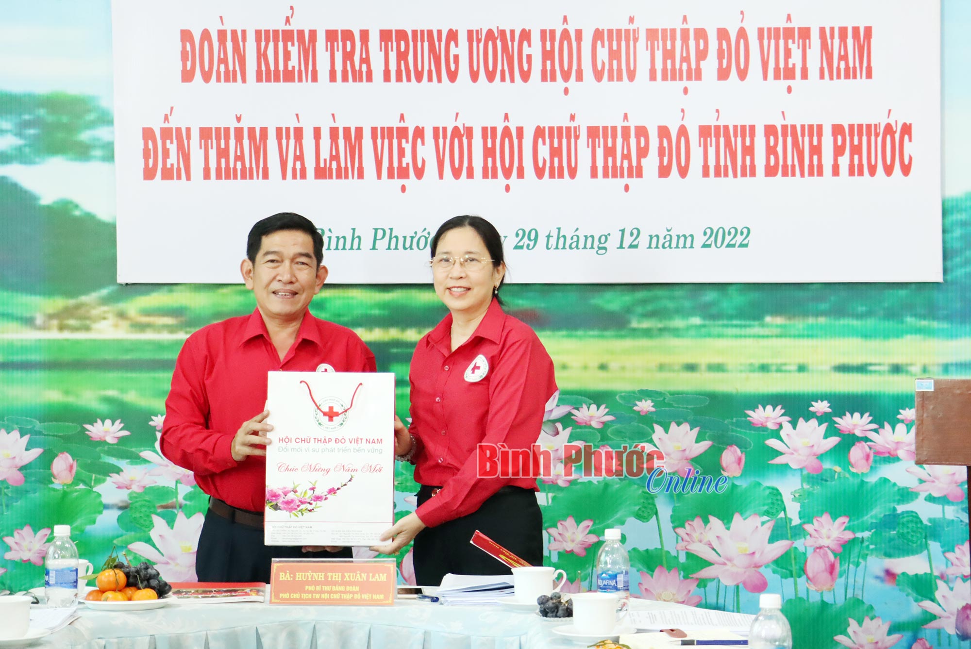Phó Chủ tịch Trung ương Hội CTĐ Việt Nam Huỳnh Thị Xuân Lam tặng quà chúc mừng năm mới Hội Chữ thập đỏ tỉnh Bình Phước