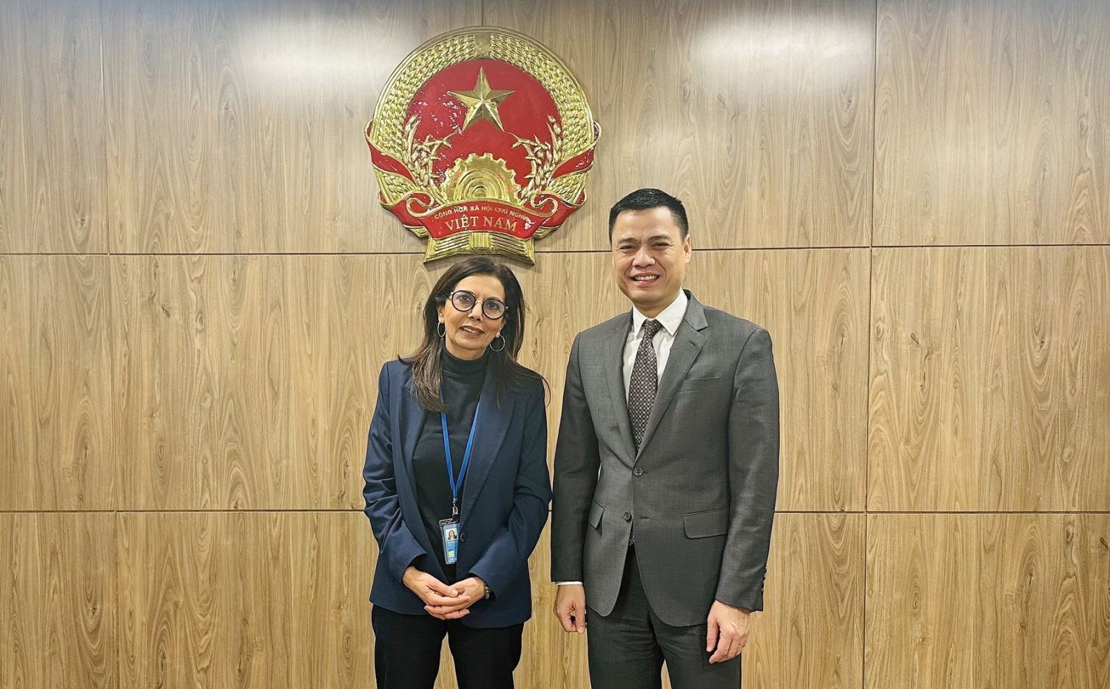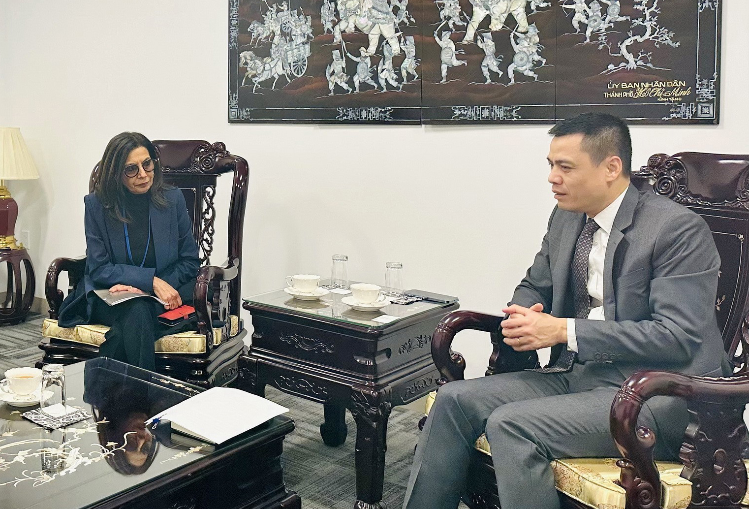Đại sứ Đặng Hoàng Giang, Trưởng Phái đoàn Đại diện Việt Nam tại Liên hợp quốc (LHQ) và Đại diện đặc biệt của Tổng Thư ký LQ Najat Maalla M’jid (trái) tại buổi làm việc ngày 16-1-2023. Ảnh: TTXVN