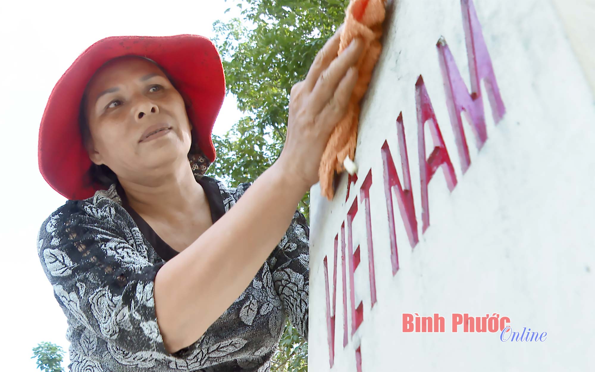 Đam mê và gắn bó với công tác mặt trận, bà Sen là thành viên của Ban điều hành và Nhân dân ấp 4 đảm nhận việc bảo vệ cột mốc biên giới. Trong ảnh: Bà Sen tham gia lau chùi cột mốc 65, vị trí số 2 giáp biên giữa ấp 3, xã Hưng Phước (Bù Đốp) với Campuchia