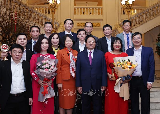 Thủ tướng Phạm Minh Chính với các tác giả, nhóm tác giả đoạt Giải báo chí toàn quốc về xây dựng Đảng lần thứ VI, năm 2021 của Thông tấn xã Việt Nam. Ảnh: Dương Giang/TTXVN