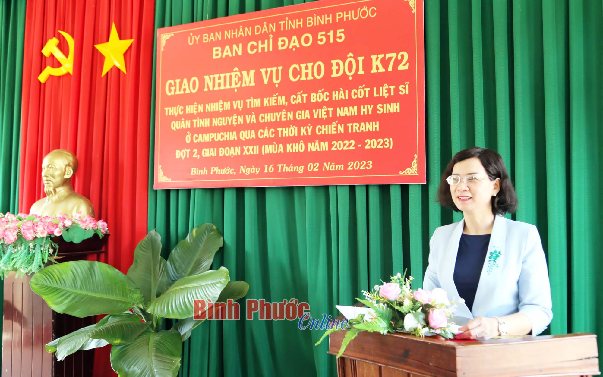 Ủy viên Ban Thường vụ, Phó Chủ tịch UBND tỉnh Trần Tuyết Minh, Trưởng ban Chỉ đạo 515 tỉnh biểu dương sự nỗ lực, cố gắng của Đội K72 đã vượt qua những khó khăn, hoàn thành xuất sắc nhiệm vụ thiêng liêng, cao cả. Chia sẻ với những khó khăn thuộc về khách quan, chủ quan, Phó Chủ tịch UBND tỉnh đề nghị Bộ Chỉ huy Quân sự tỉnh rà soát, tham khảo việc hỗ trợ kinh phí ở các tỉnh lân cận, tham mưu Ban Chỉ đạo có sự hỗ trợ cho lực lượng làm nhiệm vụ được thuận lợi nhất, đủ điều kiện, đủ nguồn lực để hoàn thành tốt nhiệm vụ.