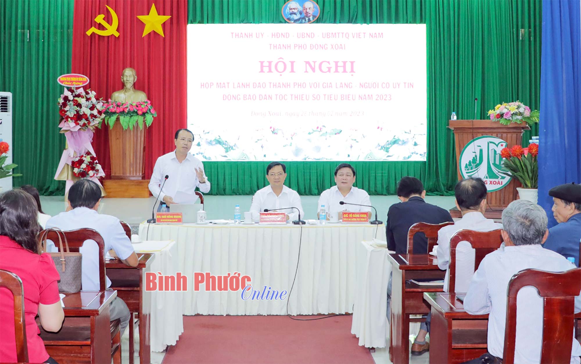 Ủy viên Ban Thường vụ Tỉnh ủy, Bí thư Thành ủy Đồng Xoài Hà Anh Dũng ghi nhận và biểu dương những đóng góp của các vị già làng, người có uy tín trong tiến trình phát triển chung của thành phố. Đồng thời mong muốn trong thời gian tới, các vị già làng, người có uy tín tiếp tục phát huy vai trò là lực lượng nòng cốt cùng với chính quyền địa phương trong tuyên truyền thay đổi tư duy, nhận thức của đồng bào DTTS thực hiện các chính sách về phát triển kinh tế, giảm nghèo, truyền “lửa” cho thế hệ trẻ trong bảo tồn và phát huy bản sắc văn hóa dân tộc. Đặc biệt là chung tay cùng thành phố Đồng Xoài thực hiện phong trào dân vận khéo “Việc phố, việc làng, đất vàng cũng hiến” đang lan tỏa sâu rộng và đạt nhiều kết quả đáng ghi nhận trong thời gian qua.