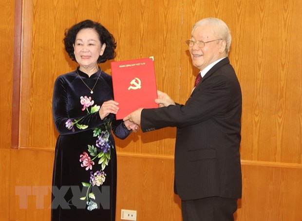 Tổng Bí thư Nguyễn Phú Trọng trao Quyết định cho đồng chí Trương Thị Mai, Ủy viên Bộ Chính trị, Thường trực Ban Bí thư. (Ảnh: Trí Dũng/TTXVN)