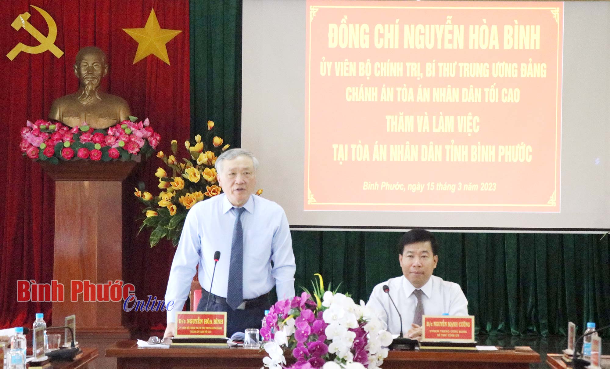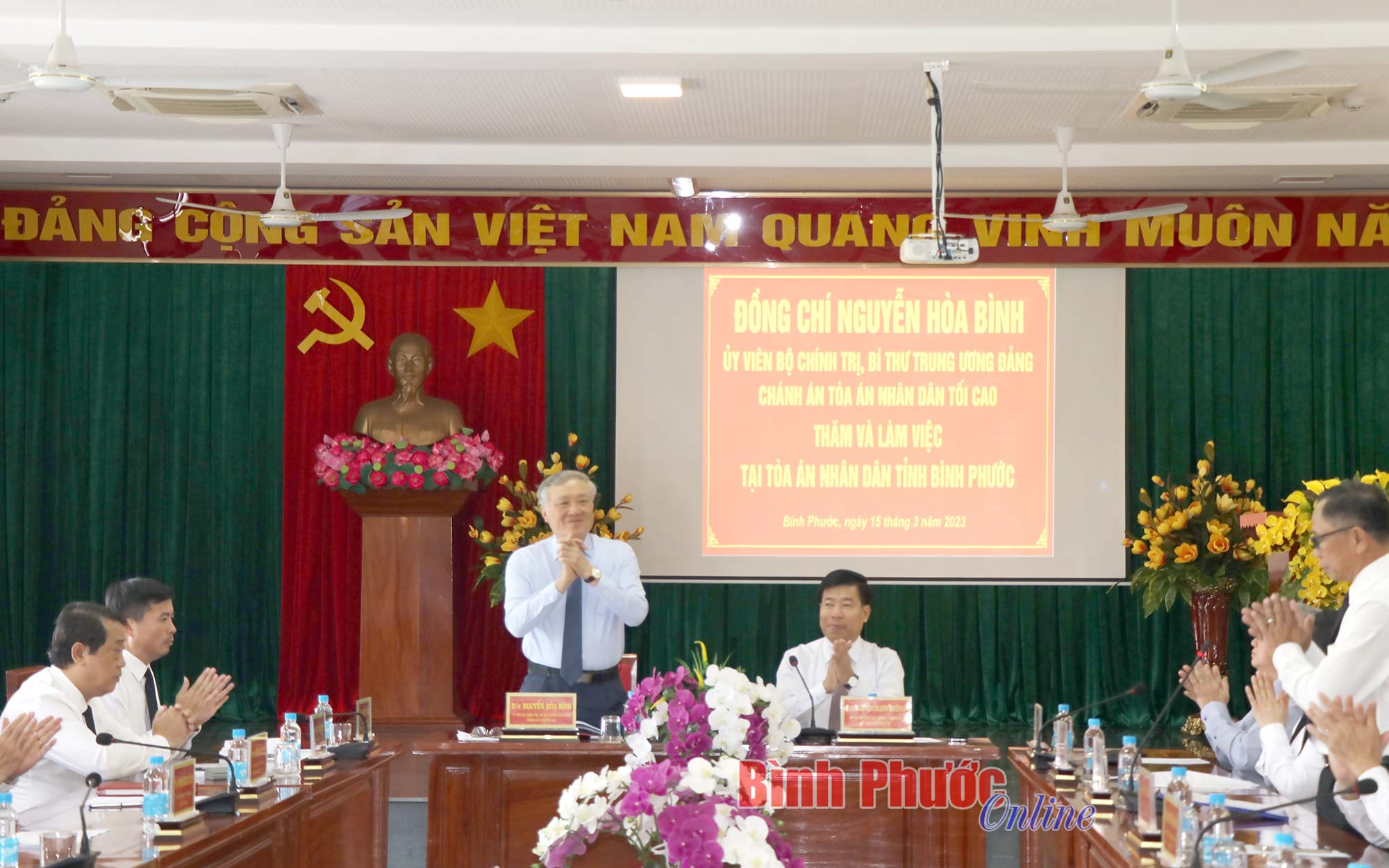 Đoàn công tác TAND tối cao làm việc với Ban Thường vụ Tỉnh ủy Bình PhướcBPO - Trong khuôn khổ chuyến công tác, chiều nay 15-3, Ủy viên Bộ Chính trị, Bí thư Trung ương Đảng, Chánh án Tòa án nhân dân (TAND) tối cao Nguyễn Hòa Bình và các thành viên đoàn công tác của TAND tối cao đã làm việc với Ban Thường vụ Tỉnh ủy Bình Phước về tình hình triển khai thực hiện Nghị quyết Đại hội XIII của Đảng, thực hiện Nghị quyết Đại hội XI Đảng bộ tỉnh và nhiệm vụ 3 tháng đầu năm 2023.
