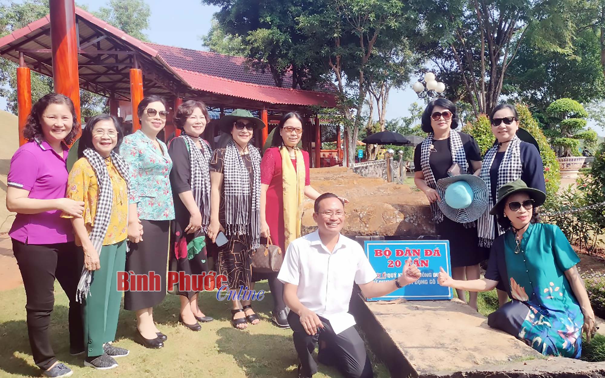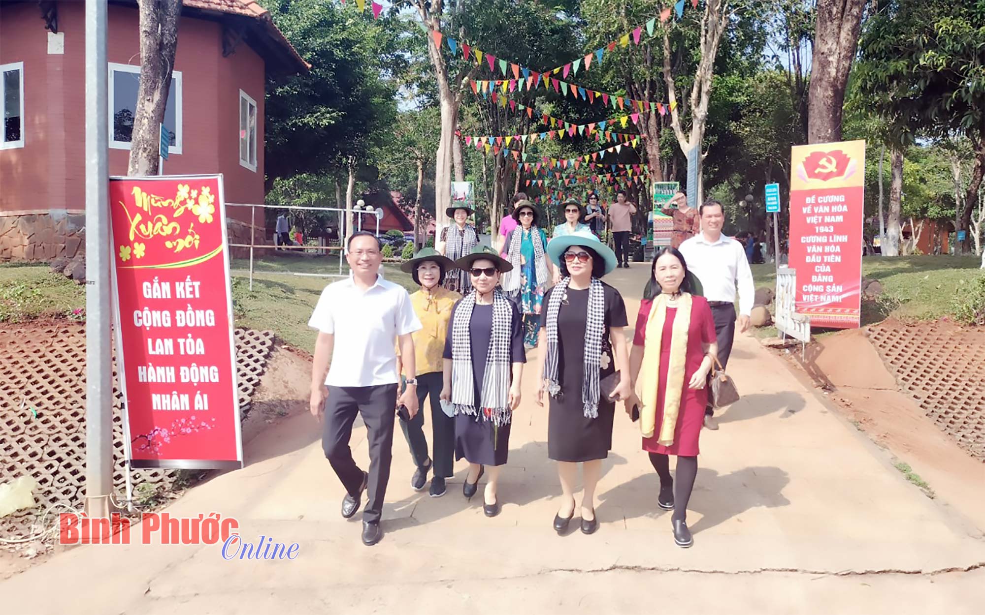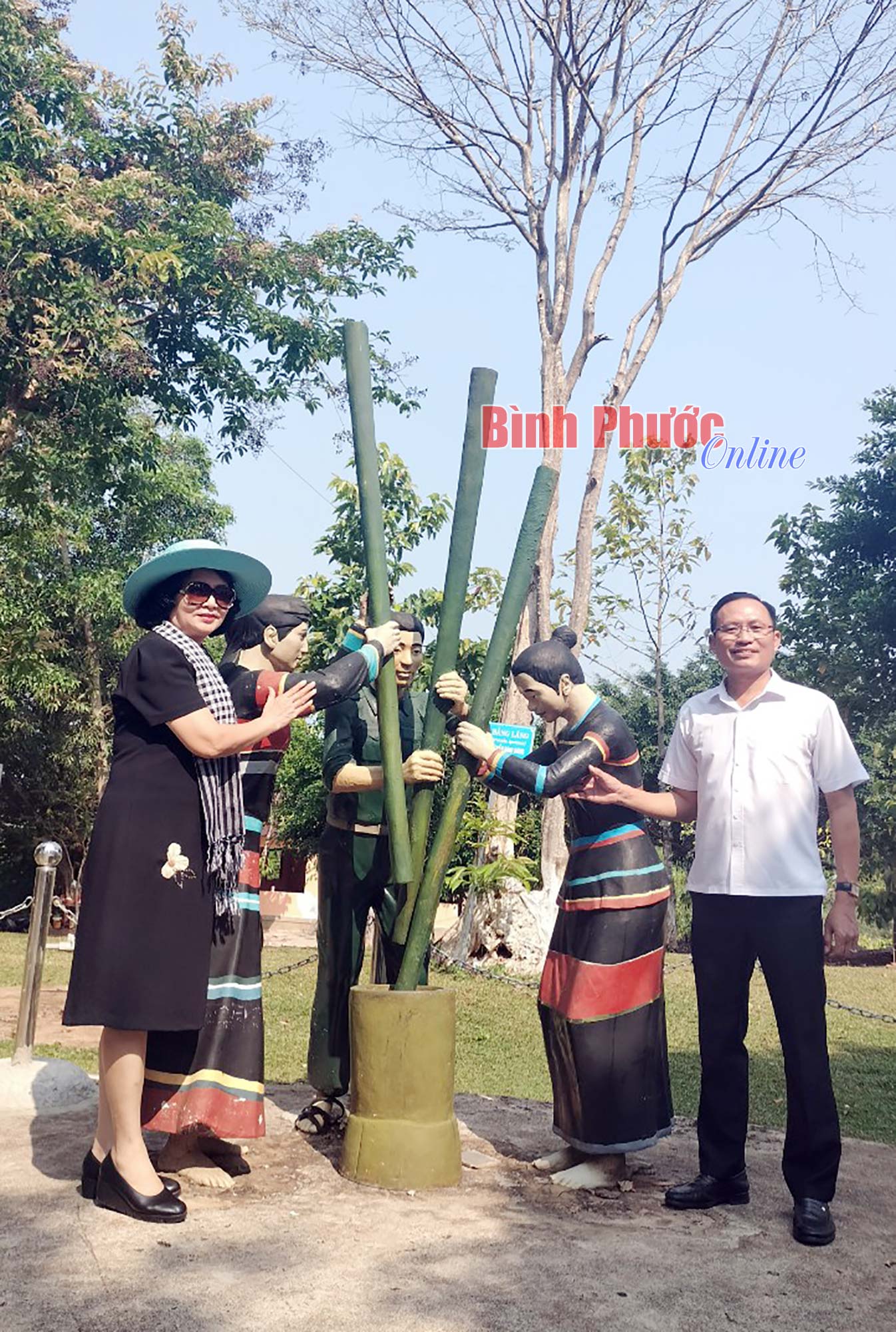 Nguyên Phó Chủ tịch nước Đặng Thị Ngọc Thịnh cùng đoàn công tác tham quan, chụp hình lưu niệm với lãnh đạo UBND huyện Bù Đăng và cán bộ quản lý Khu bảo tồn văn hóa dân tộc S’tiêng sóc Bom Bo