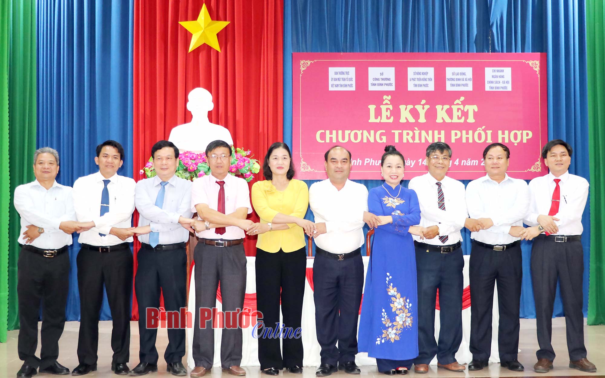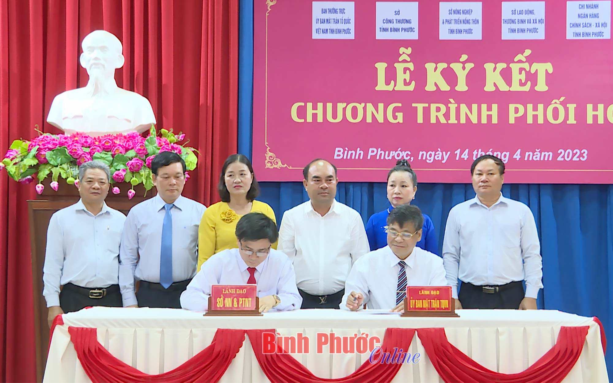 Ủy viên Ban Thường vụ, Trưởng ban Dân vận Tỉnh ủy, Chủ tịch UBMTTQVN tỉnh Lê Thị Xuân Trang cho biết, các chương trình phối hợp giữa Ban Thường trực UBMTTQVN tỉnh với các ngành trong giai đoạn 2021-2025 gồm: Phối hợp với Sở Công Thương đẩy mạnh Cuộc vận động “Người Việt Nam ưu tiên dùng hàng Việt Nam” trong tình hình mới; thực hiện nhiệm vụ xây dựng và phát triển nông nghiệp, nông thôn với Sở Nông nghiệp và phát triển nông thôn; thực hiện chương trình mục tiêu quốc gia giảm nghèo bền vững giai đoạn 2021-2025 trên địa bàn tỉnh với Sở Lao động - Thương binh và Xã hội; phối hợp tuyên truyền, phổ biến các chủ trương, đường lối của Đảng, chính sách, pháp luật của Nhà nước về tín dụng chính sách xã hội; tuyên truyền về phong trào “Vì người nghèo – Không để ai bỏ lại phía sau”; hoạt động Quỹ “Vì người nghèo” các cấp; kết quả thực hiện tín dụng chính sách xã hội; hoạt động của Ngân hàng Chính sách xã hội với Chi nhánh Ngân hàng Chính sách xã hội tỉnh Bình Phước.