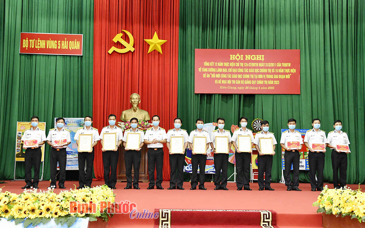 Thủ trưởng Bộ Tư lệnh Vùng 5 Hải quân trao thưởng cho các thí sinh đạt thành tích tốt trong hội thi cán bộ giảng dạy chính trị cấp cơ sở