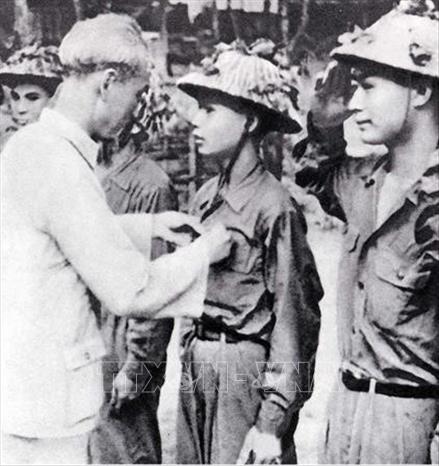 Chủ tịch Hồ Chí Minh tặng Huy hiệu “Chiến sĩ Điện Biên Phủ” cho những chiến sĩ lập công xuất sắc trong chiến dịch Điện Biên Phủ - Ảnh: Tư liệu TTXVN