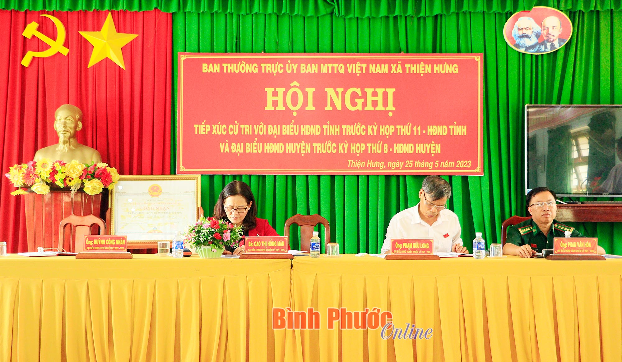 Tại buổi tiếp xúc, cử tri có 15 lượt ý kiến, kiến nghị đến đại biểu HĐND 2 cấp liên quan đến các vấn đề: bồi thường giải tỏa đền bù chưa thỏa đáng theo khung giá thị trường; hệ thống thoát nước khu vực ngoại ô thị trấn Thanh Bình còn nhiều bất cập vào mùa mưa; việc cấp giấy chứng nhận quyền sử dụng đất; thiếu điện (điện yếu) phục vụ sản xuất, hộ gia đình; việc tăng giá điện sinh hoạt. Cử tri cũng kiến nghị và mong muốn tại các ngã ba, ngã tư đường cần gắn biển báo, đèn tín hiệu giao thông nhằm góp phần giảm thiểu tai nạn…
