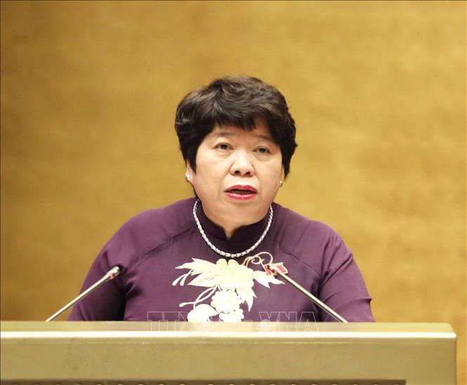 Chủ nhiệm Ủy ban Xã hội cuả Quốc hội Nguyễn Thuý Anh trình bày Báo cáo của Đoàn giám sát Quốc hội về việc huy động, quản lý và sử dụng các nguồn lực phục vụ công tác phòng, chống dịch COVID-19; việc thực hiện chính sách, pháp luật về y tế cơ sở, y tế dự phòng. Ảnh: Phương Hoa/TTXVN
