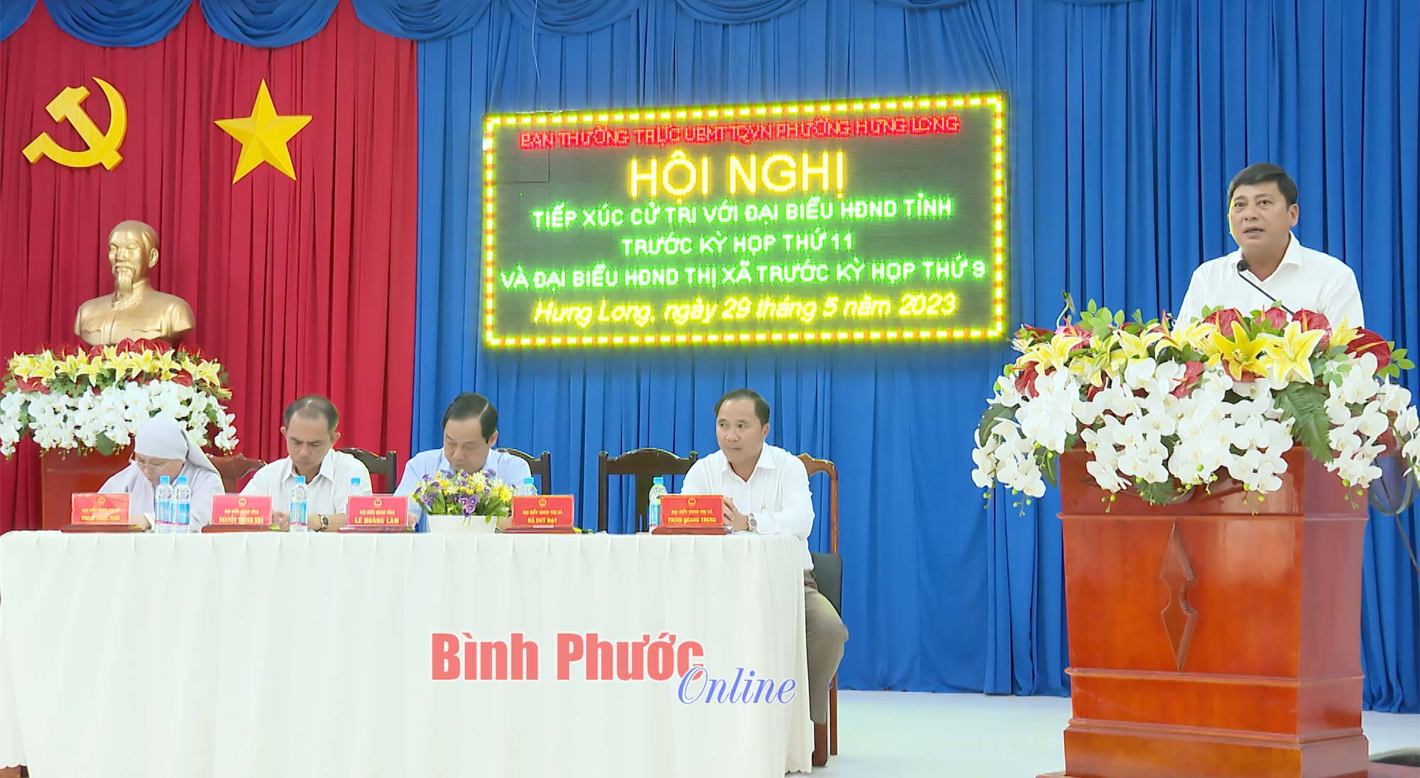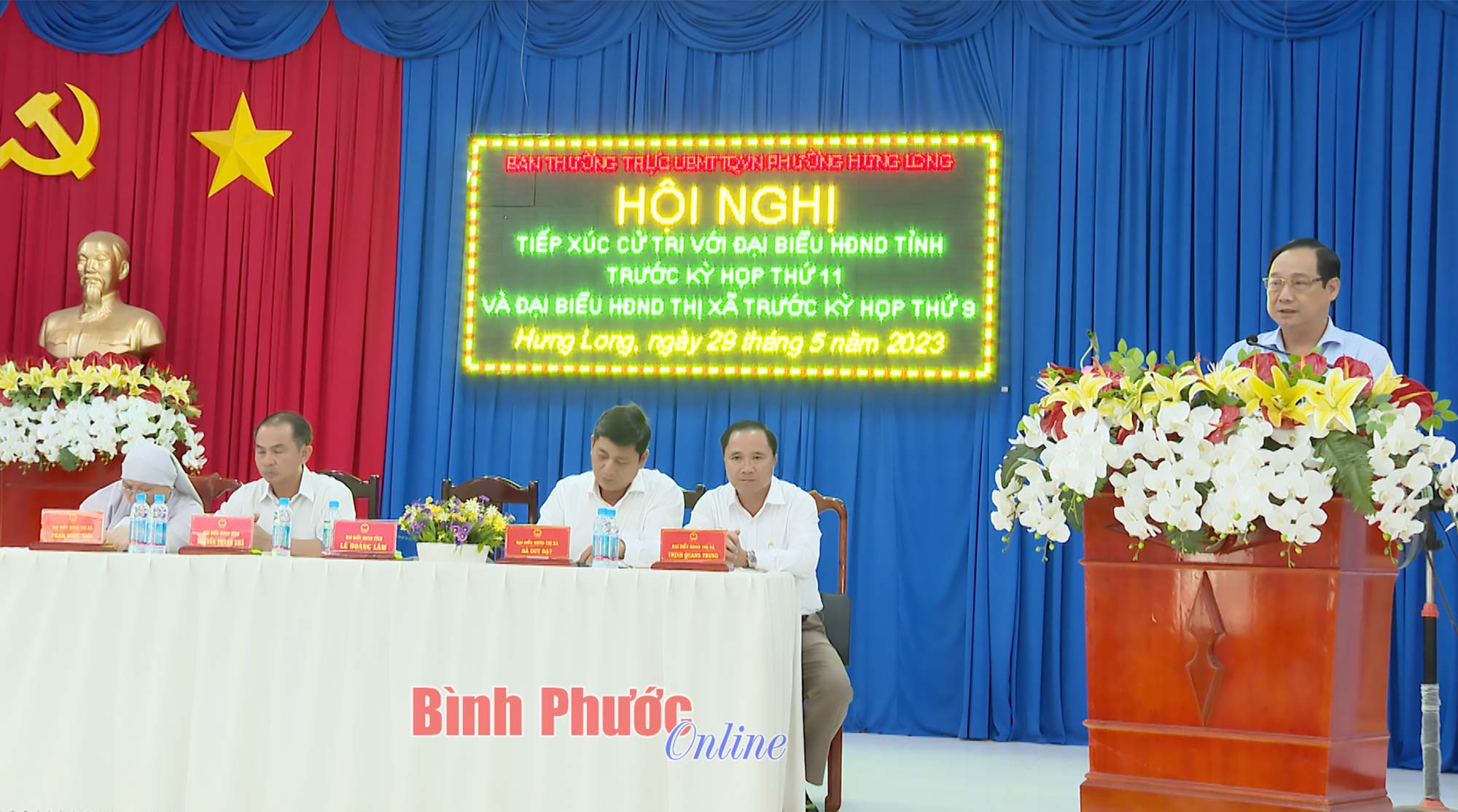 Tại buổi tiếp xúc, cử tri phường Hưng Long đã có các ý kiến, kiến nghị liên quan đến nội dung: cần nhanh chóng cấp giấy chứng nhận quyền sử dụng đất đối với đất tái định cư Dự án Becamex - Bình Phước; duy trì cấp Báo Bình Phước, báo Đảng cho các đảng viên cao tuổi Đảng; quan tâm chăm sóc, cắt tỉa cây xanh vỉa hè các tuyến đường đô thị; cần có kế hoạch nạo vét cống một số tuyến đường đô thị để đảm bảo thoát nước vào mùa mưa; sớm đầu tư nâng cấp một số tuyến đường giao thông; quan tâm đầu tư cơ sở vật chất khu phòng điều trị trung cao tại Trung tâm Y tế thị xã…