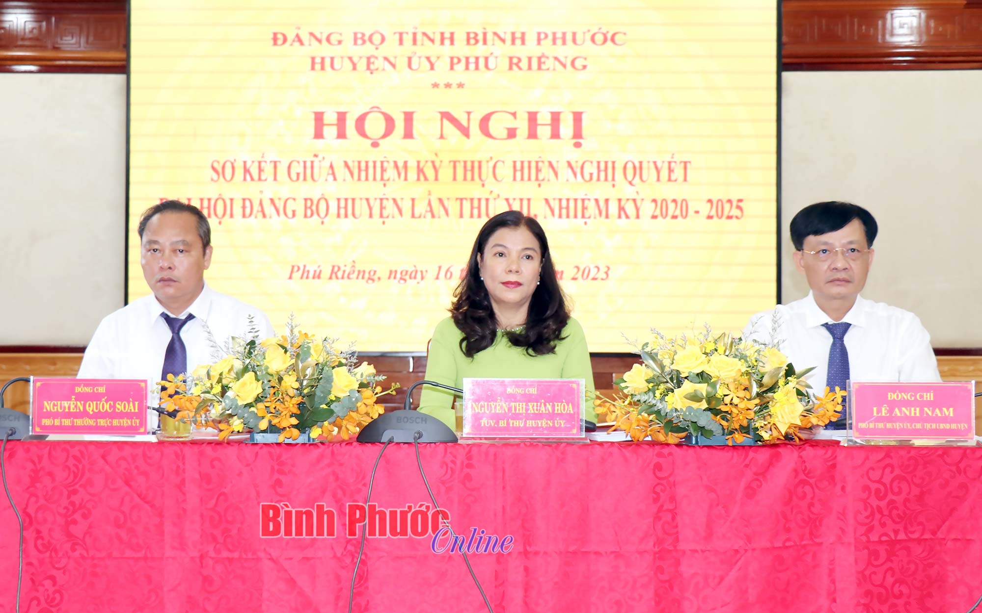 Về nhiệm vụ trọng tâm trong nửa nhiệm kỳ còn lại, Bí thư Huyện ủy Phú Riềng Nguyễn Thị Xuân Hòa nêu rõ: Tập trung điều hành hiệu quả việc thu, chi ngân sách; thực hiện các giải pháp nhằm khai thác tốt các nguồn thu, tăng cường tiết kiệm chi ngân sách, nhất là các khoản chi thường xuyên để tập trung nguồn vốn cho đầu tư xây dựng cơ bản, nông thôn mới, đảm bảo huyện Phú Riềng về đích nông thôn mới theo Nghị quyết đề ra thực chất, hiệu quả; đẩy nhanh tiến độ triển khai các dự án lớn, trọng điểm; từng bước chỉnh trang, hoàn thiện bộ mặt khu trung tâm hành chính huyện. Phú Riềng cũng sẽ huy động nguồn lực xã hội đầu tư cho sự nghiệp văn hóa, thể thao, du lịch. Tiếp tục thực hiện chương trình kiên cố hóa trường, lớp; xây dựng trường chuẩn quốc gia, nâng cao chất lượng dạy và học; tập trung giảm tỷ hộ nghèo, hộ cận nghèo; giải quyết việc làm cho người lao động.