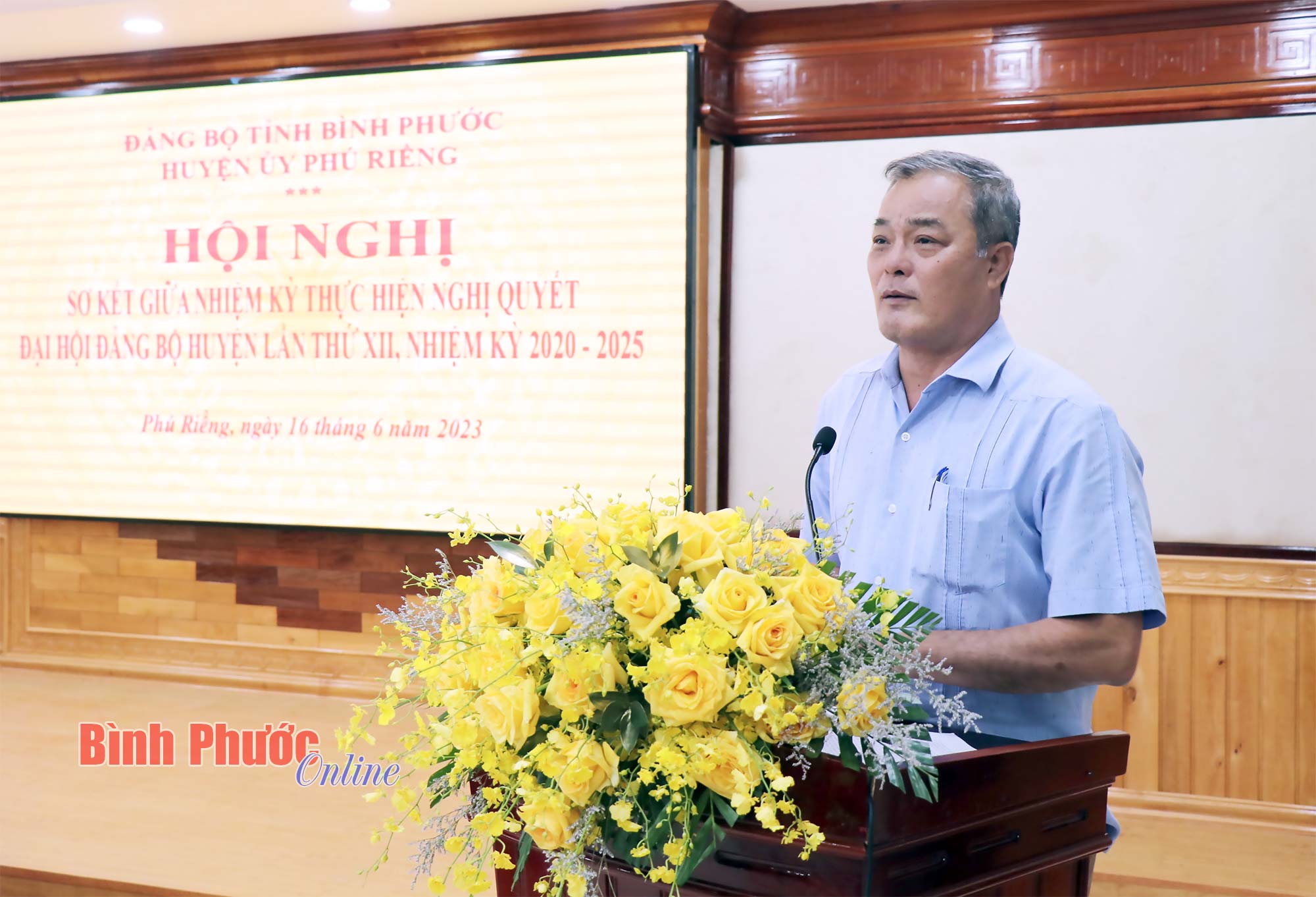 Sau hơn 2,5 năm thực hiện nghị quyết Đại hội Đảng bộ huyện lần thứ XII nhiệm kỳ 2020-2025, đến nay, Phú Riềng đã có 14 chỉ tiêu đạt và vượt (6 chỉ tiêu chưa đánh). Huyện đã đẩy mạnh việc thực hiện 2 chương trình đột phá, gồm: Chương trình Chuyển dịch cơ cấu kinh tế, phát triển ngành công nghiệp và Chương trình quy hoạch kết cấu hạ tầng trung tâm các xã, trọng tâm là nhựa hóa đường liên huyện, liên xã.