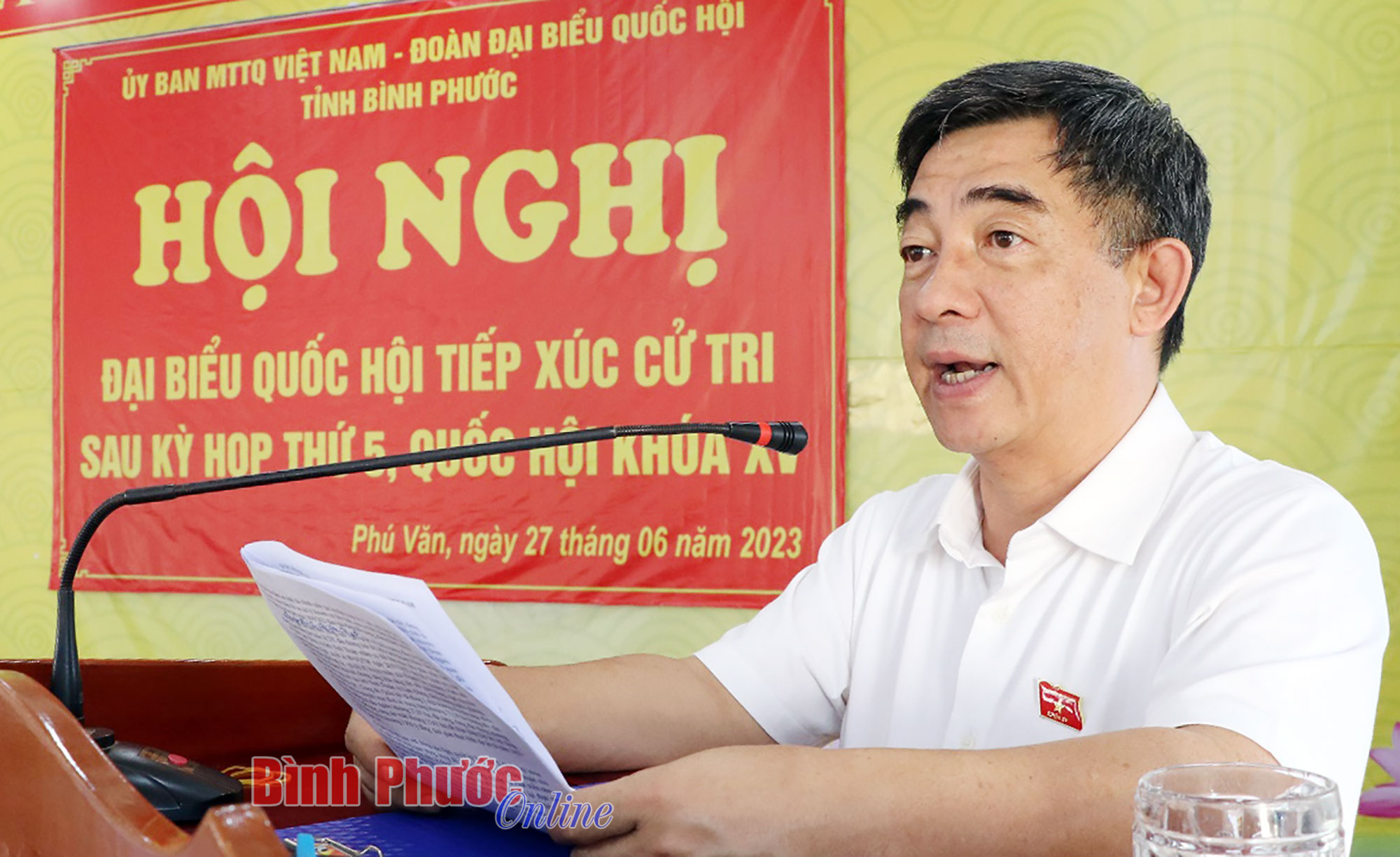Thông báo với cử tri kết quả kỳ họp thứ 5, hoạt động của Đoàn đại biểu Quốc hội tỉnh Bình Phước tại kỳ họp, đại biểu Huỳnh Thành Chung cho biết, kỳ họp lần này đã hoàn thành chương trình đề ra với nhiều nội dung quan trọng về công tác lập pháp, giám sát. Quốc hội đã thông qua 8 dự án luật, 7 dự thảo nghị quyết; thảo luận, góp ý cho 9 dự án luật và quyết định nhiều vấn đề quan trọng của đất nước.