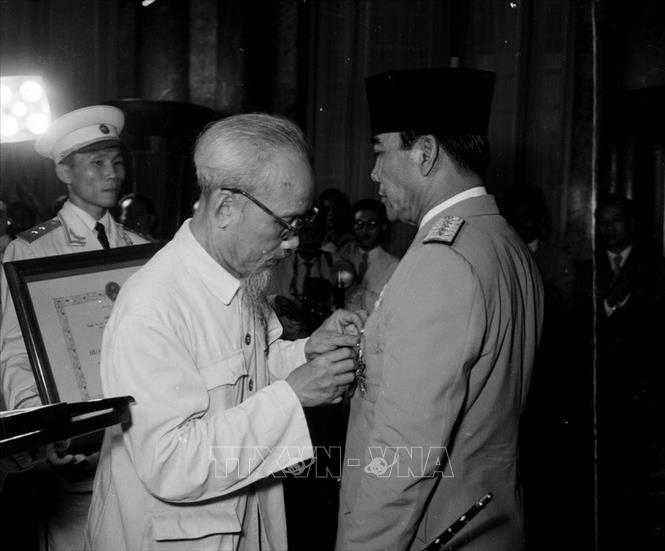 Chủ tịch Hồ Chí Minh trao tặng Tổng thống Sukarno Huân chương Lao động hạng Nhất tại Phủ Chủ tịch (1959). Ảnh: TTXVN