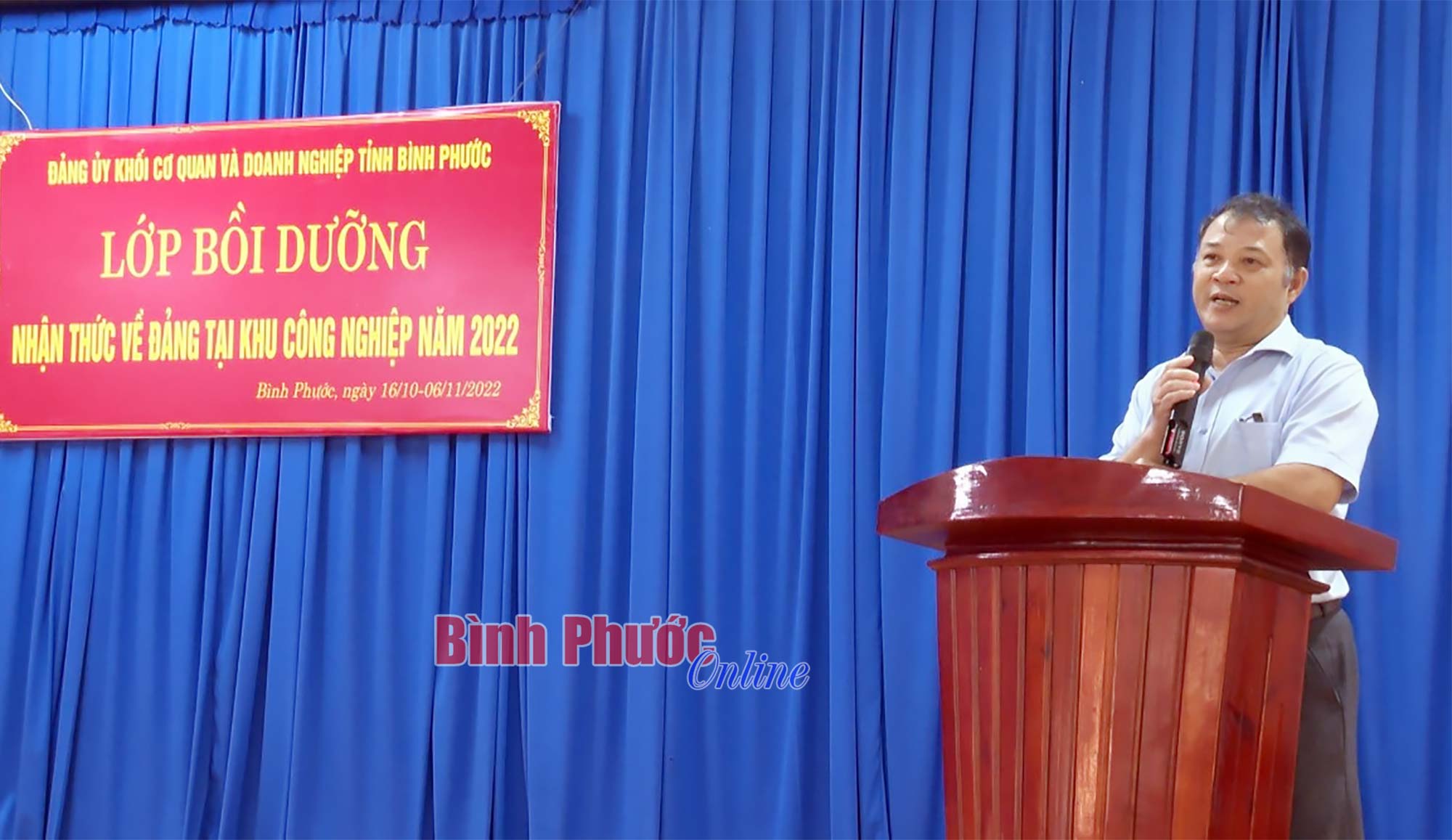 Phó Bí thư Đảng ủy Khối Cơ quan và Doanh nghiệp tỉnh Nguyễn Phúc Bảy phát biểu tại lớp bồi dưỡng nhận thức về Đảng cho công nhân, lao động ưu tú tại khu công nghiệp