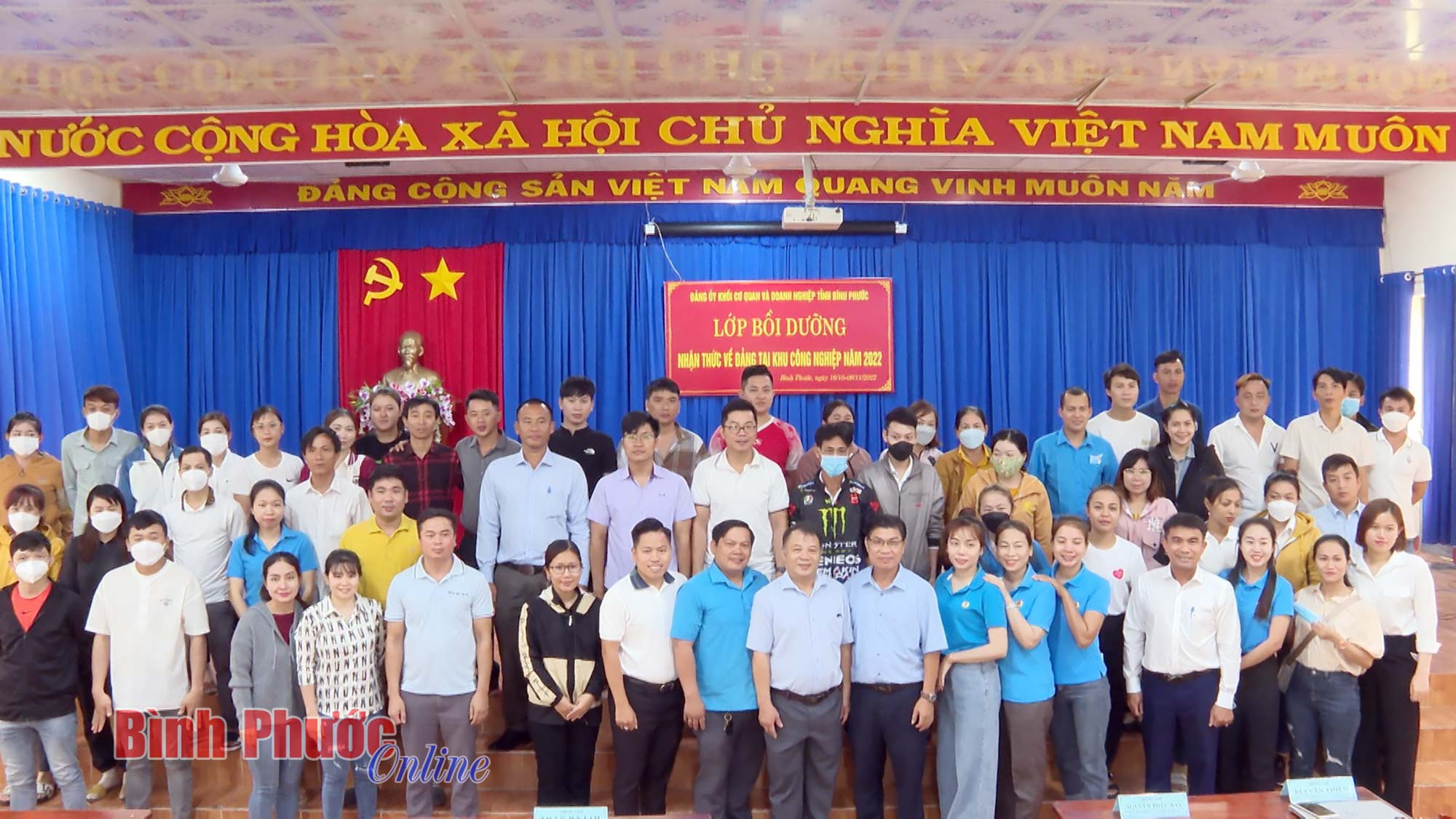 Học viên lớp bồi dưỡng nhận thức về Đảng thuộc khu công nghiệp trên địa bàn TX. Chơn Thành chụp hình lưu niệm với các báo cáo viên Đảng ủy Khối Cơ quan và Doanh nghiệp tỉnh