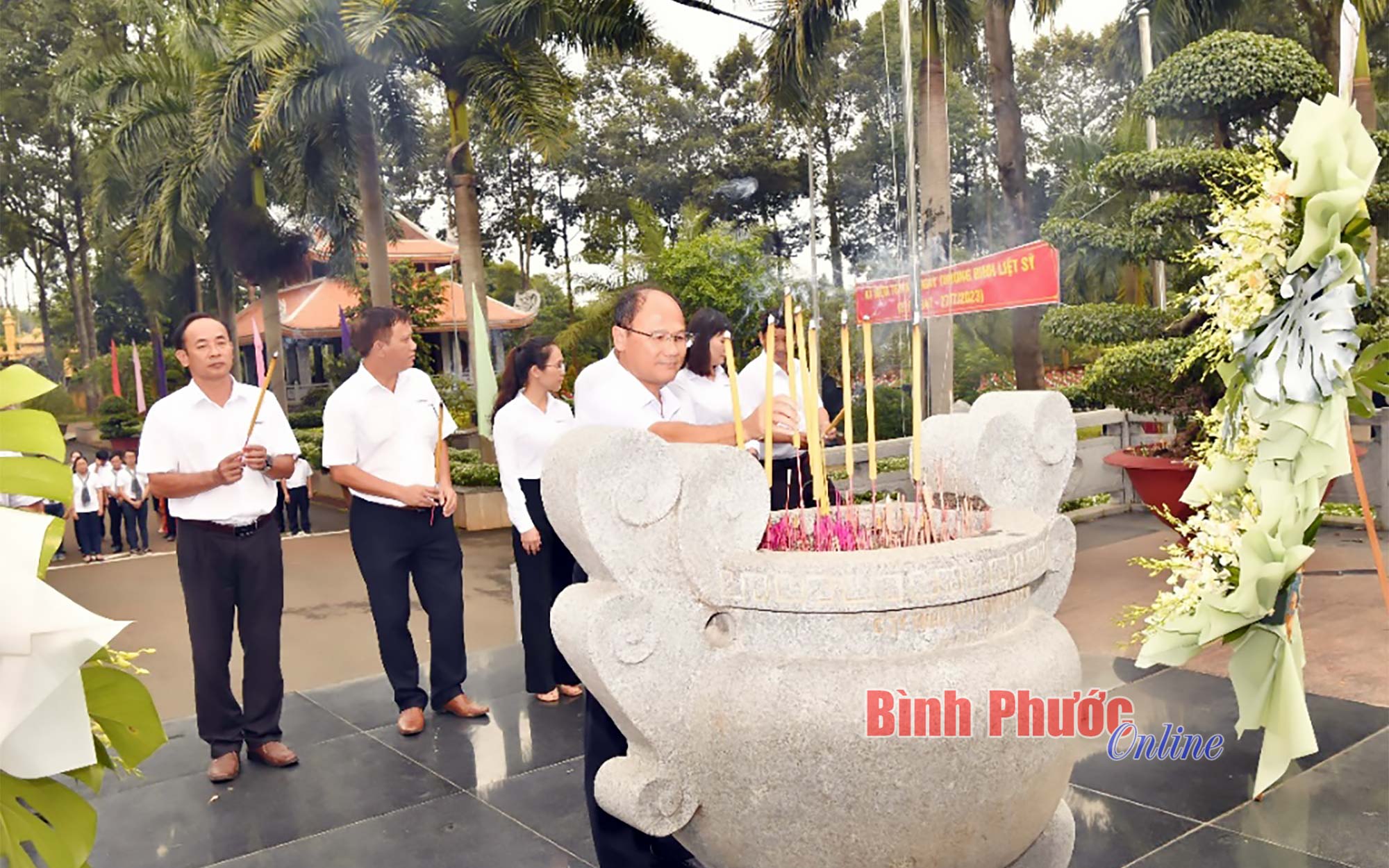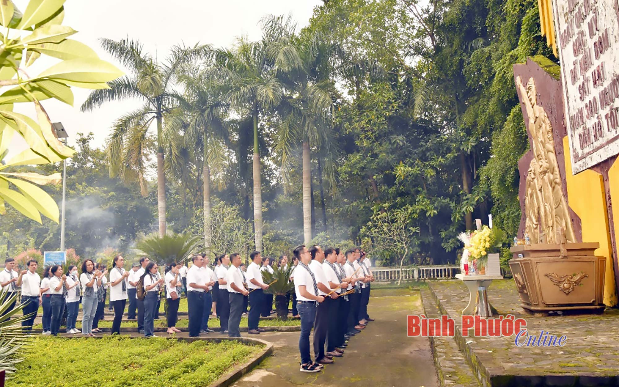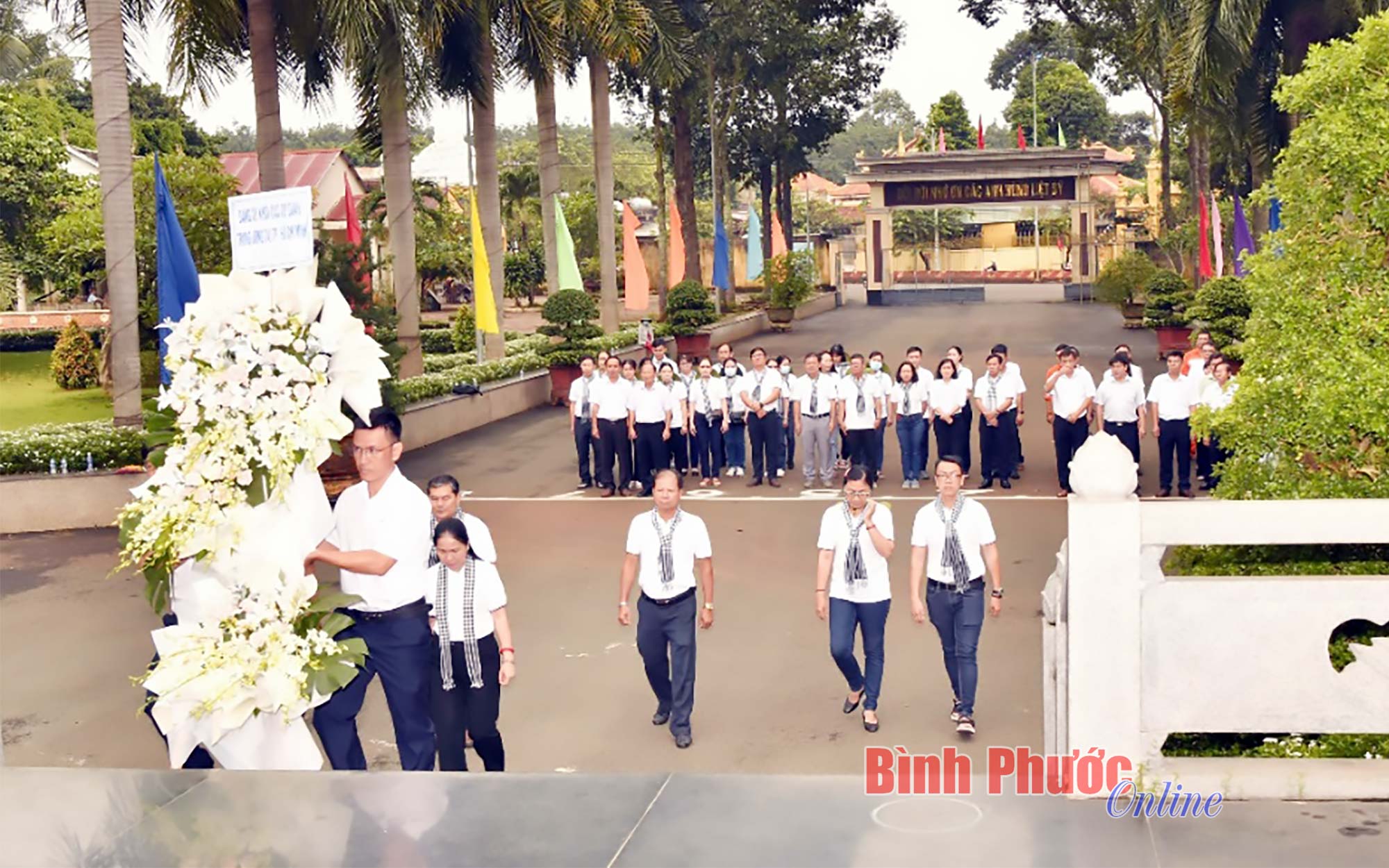 Tại Nghĩa trang liệt sĩ thị xã Phước Long, trong không khí trang nghiêm, các thành viên đoàn đã tưởng niệm, bày tỏ lòng biết ơn sâu sắc trước sự hy sinh to lớn của các anh hùng, liệt sĩ đã cống hiến trọn đời cho nền độc lập tự do của Tổ quốc, hạnh phúc của nhân dân. Sau khi đặt vòng hoa, đoàn đã thắp hương trên từng phần mộ liệt sĩ để tri ân.