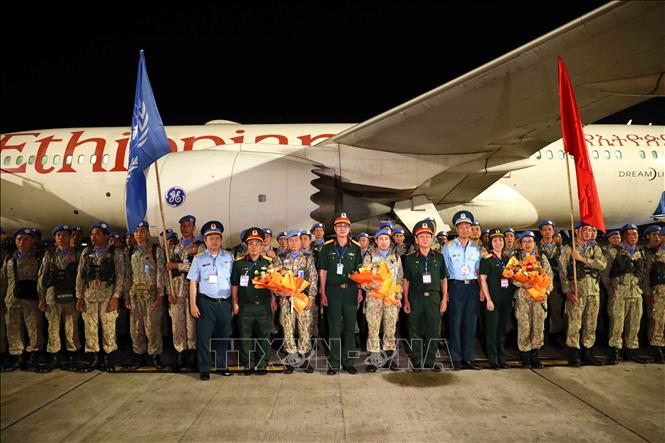 Đội Công binh số 1 về đến Sân bay quốc tế Nội Bài sau khi hoàn thành nhiệm vụ tại địa bàn Phái bộ UNISFA (khu vực Abyei). Ảnh: An Đăng/TTXVN
