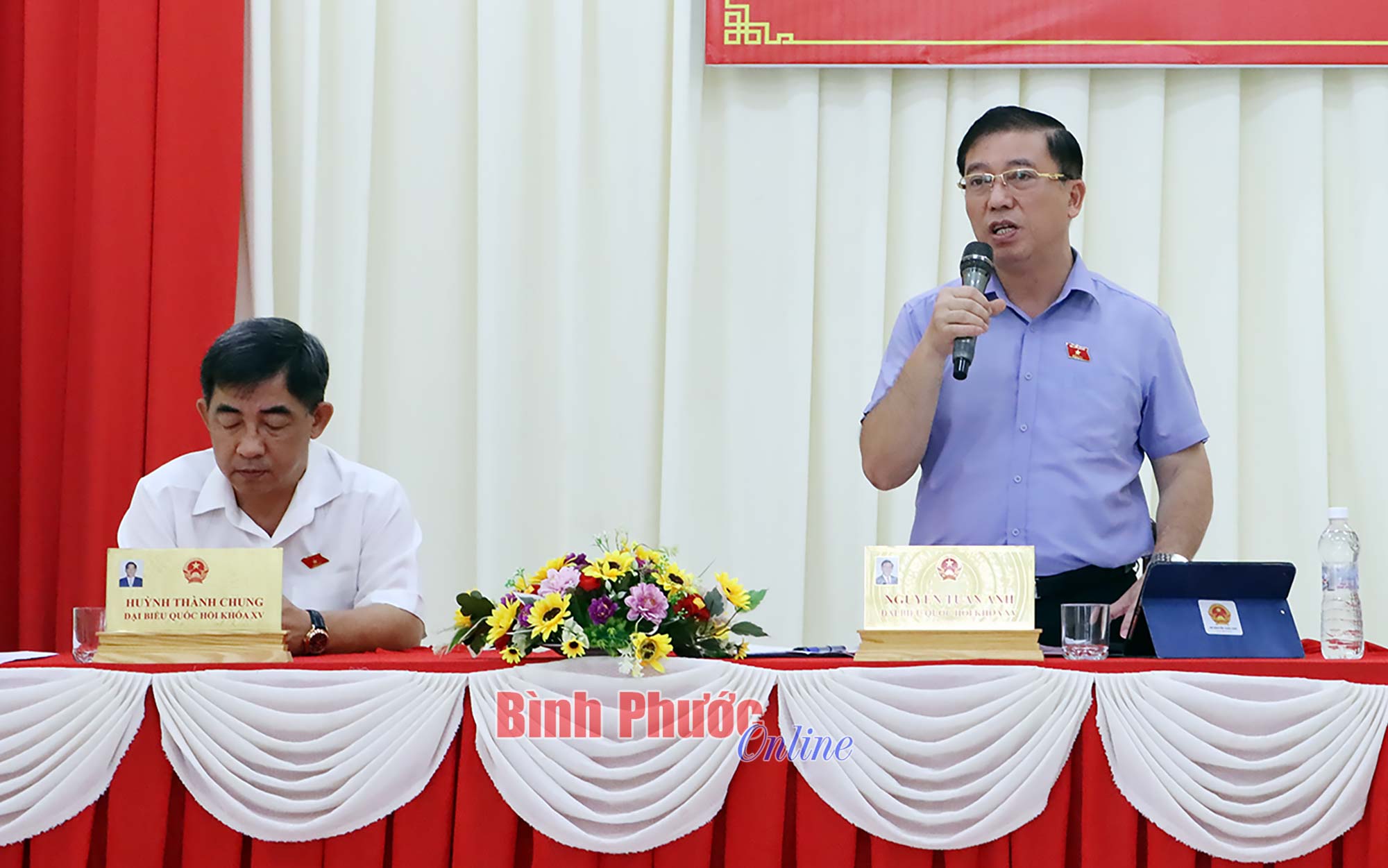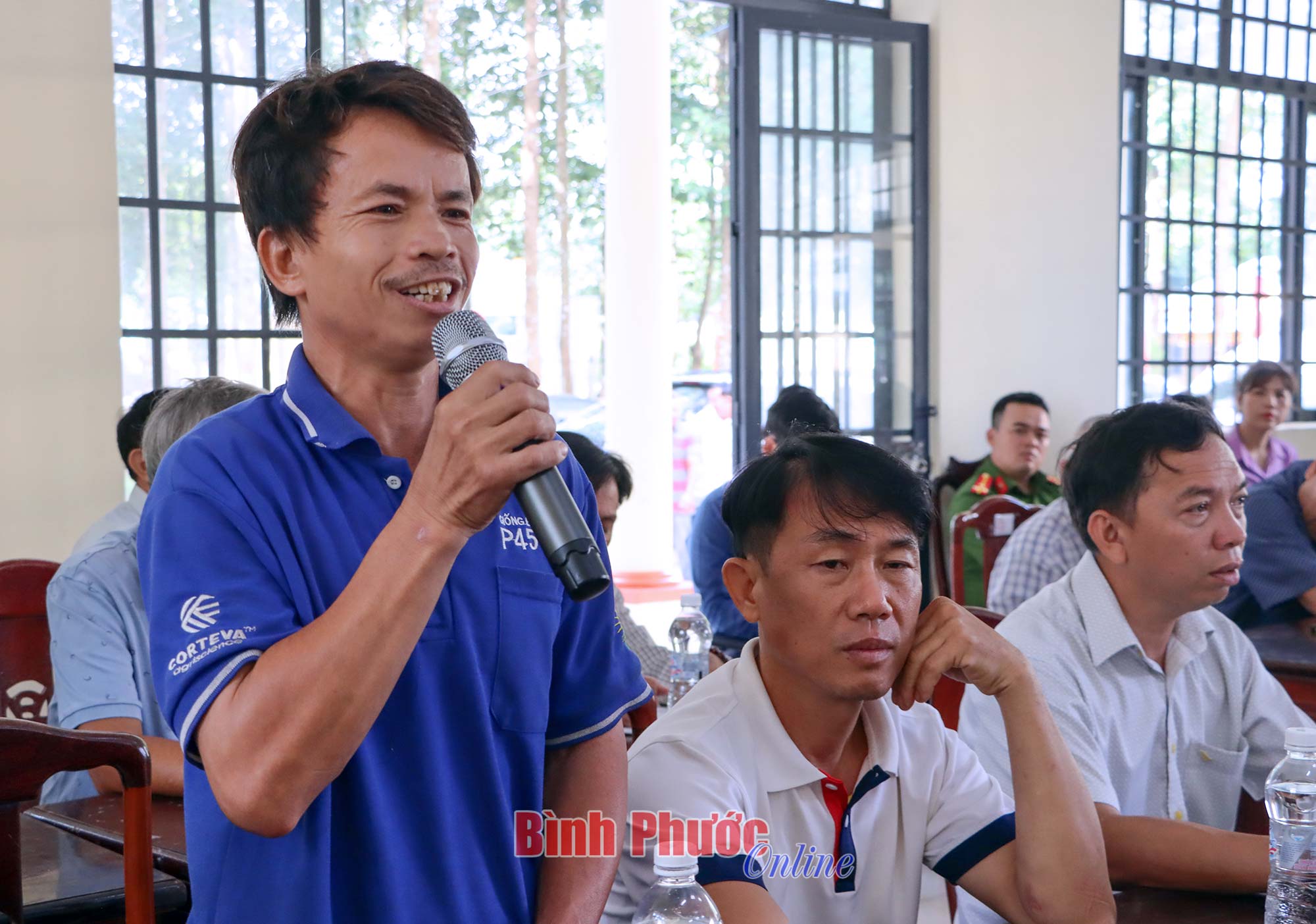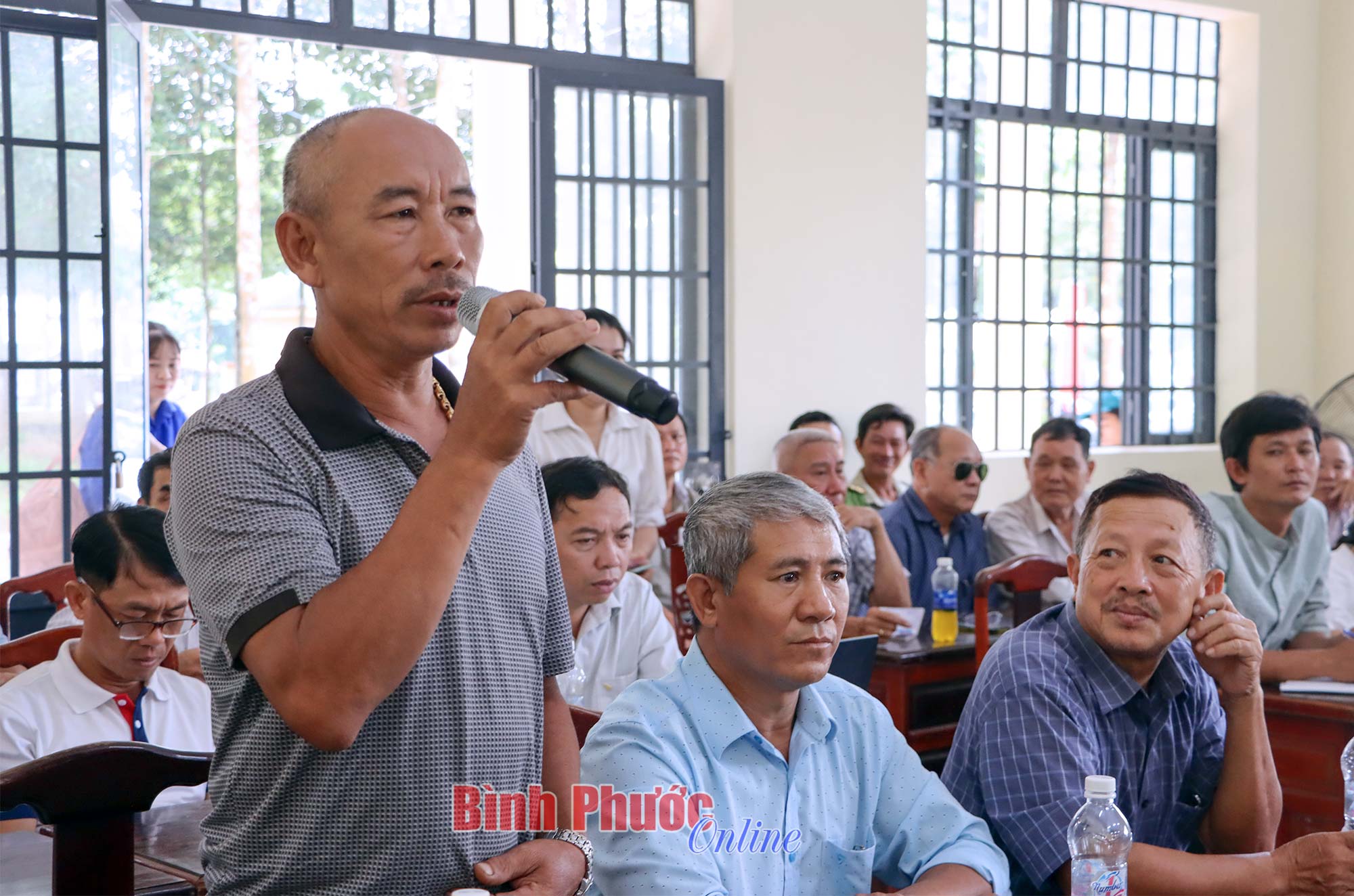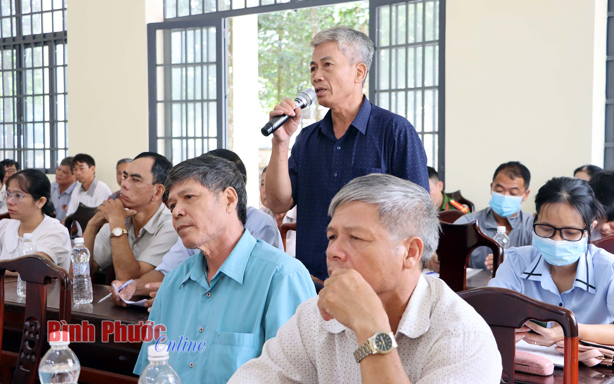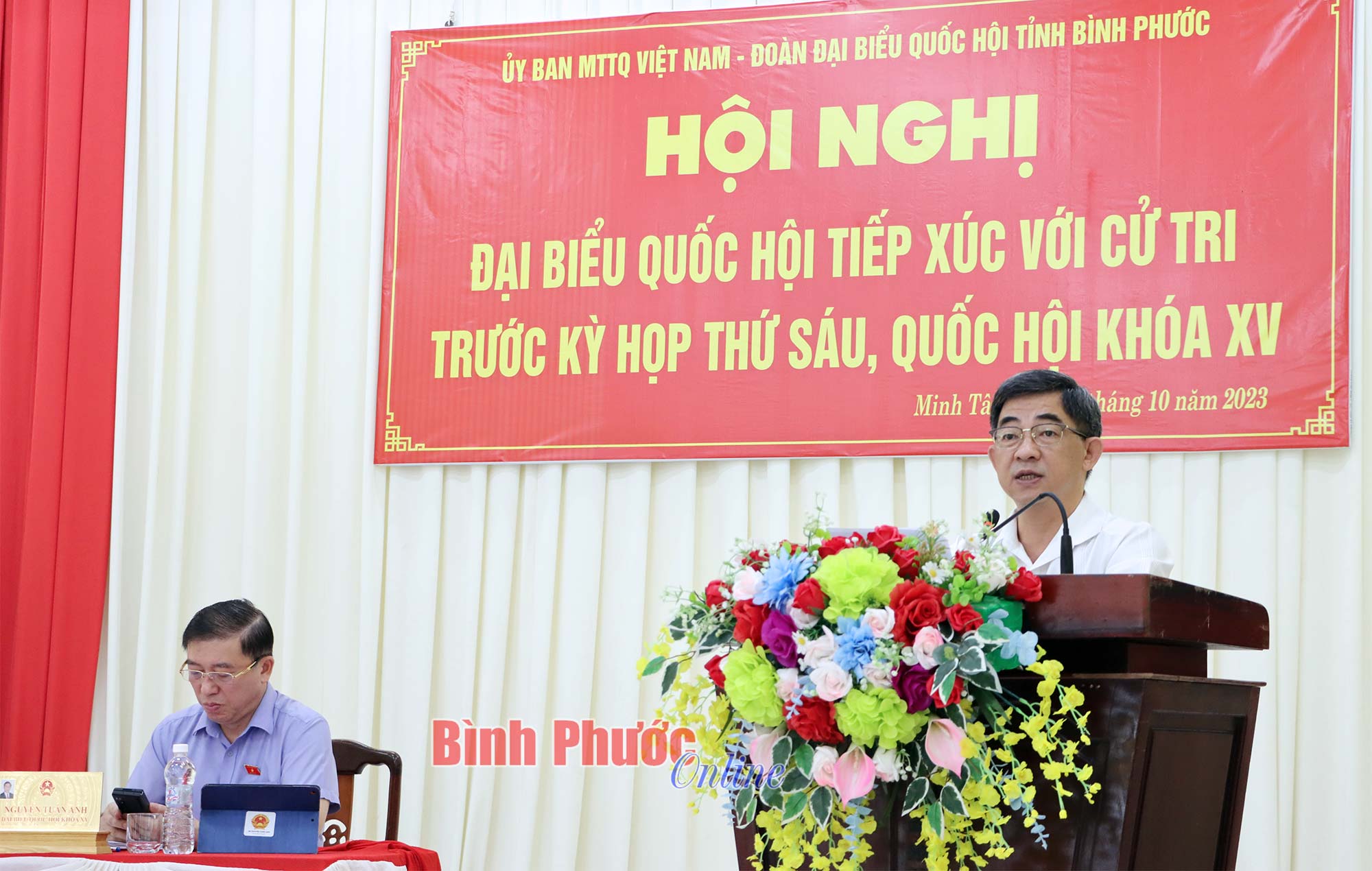 Cử tri đã có 13 ý kiến, kiến nghị phản ánh đến đại biểu Quốc hội. Cụ thể, cử tri xã An Phú phản ánh một số tuyến đường giao thông trên địa bàn xuống cấp cần sớm được sửa chữa. Cử tri xã Minh Tâm mong được đầu tư đường điện thắp sáng. Đại diện 23 hộ dân xã Minh Đức kiến nghị được cấp giấy chứng nhận quyền sử dụng đất để ổn định cuộc sống. Một số cử tri lo lắng về tình trạng ô nhiễm môi trường do một số nhà máy chế biến mủ cao su và trang trại chăn nuôi heo gây ra…