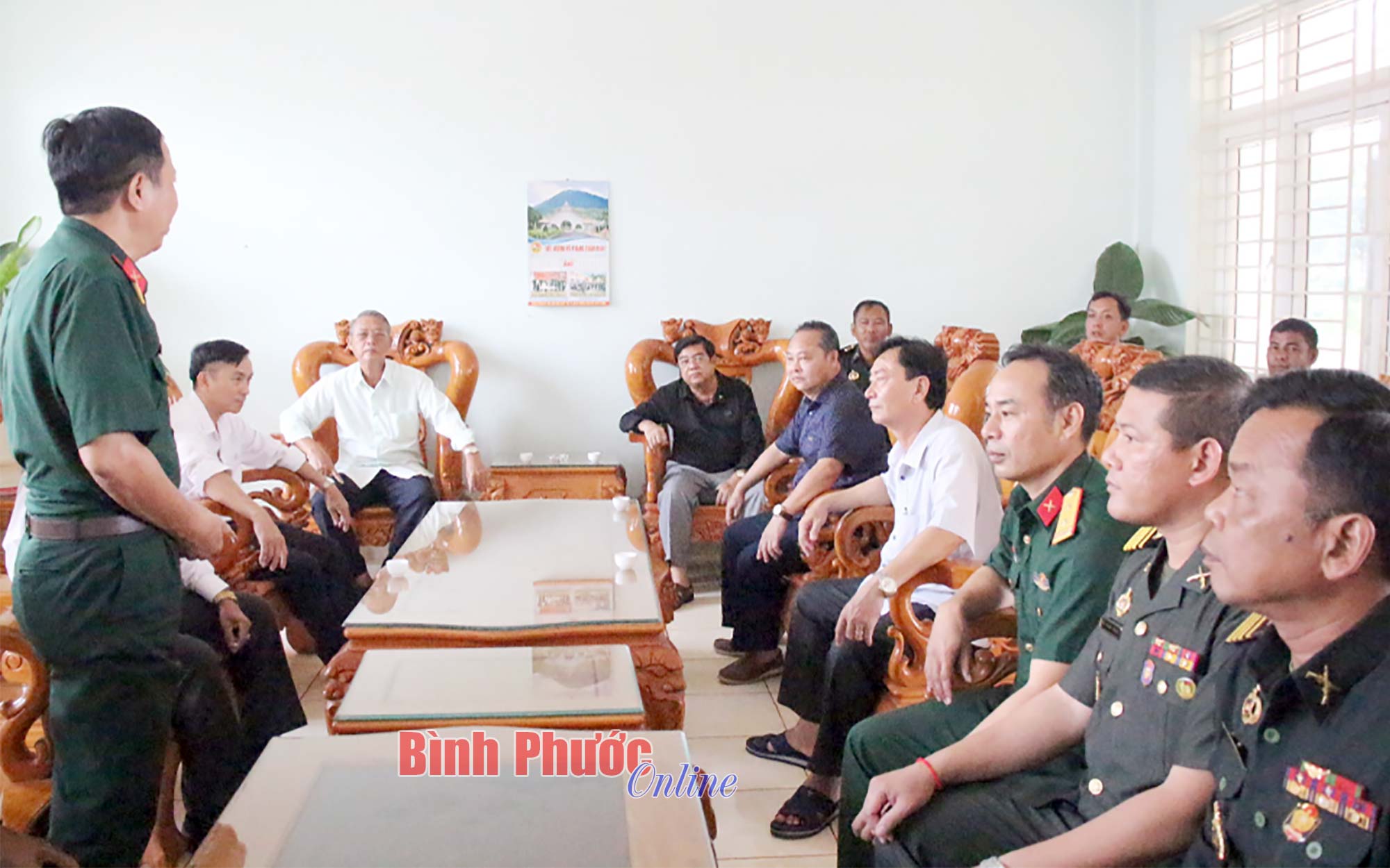 Thiếu tướng Võ Quyết Chiến, nguyên Chính ủy Bộ Tư lệnh Binh đoàn 16, nguyên Phó Chủ nhiệm Cục Chính trị Quân khu 7; Đại tá Nguyễn Phi Hùng, nguyên Ủy viên Ban Thường vụ Tỉnh ủy, nguyên Chỉ huy trưởng Bộ Chỉ huy Quân sự tỉnh Bình Phước; Đại tá Phạm Khắc Toán, Phó Chỉ huy trưởng, Tham mưu trưởng Bộ Chỉ huy Quân sự tỉnh; Đại tá Nguyễn Thành Ruân, Phó Chính ủy, Bộ Chỉ huy Quân sự tỉnh; Phó Bí thư Thường trực Huyện ủy, Chủ tịch HĐND huyện Nguyễn Quốc Soài tiếp và làm việc với đoàn.