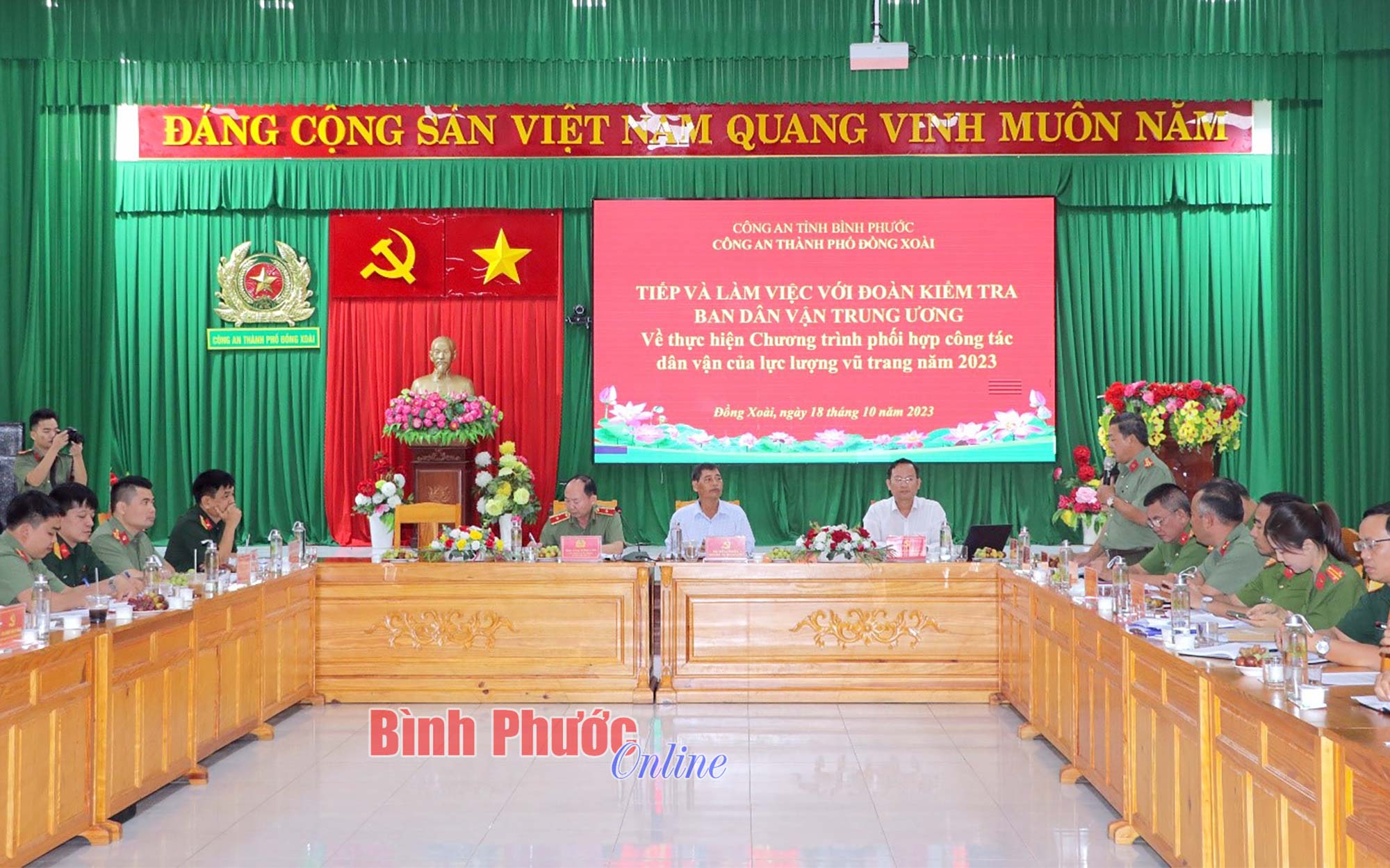 Tại buổi làm việc, Công an thành phố Đồng Xoài và Ban Chỉ huy Quân sự huyện Đồng Phú đã báo cáo kết quả chương trình phối hợp công tác dân vận của lực lượng vũ trang năm 2023. Theo đó, năm 2023, Công an thành phố Đồng Xoài đăng ký thực hiện 10 mô hình trên lĩnh vực an ninh trật tự; duy trì mô hình “Đội thanh niên xung kích phòng chống tội phạm”; thực hiện và duy trì mô hình “1.000 camera giám sát an ninh”. Ban Chỉ huy Quân sự huyện Đồng Phú cũng huy động lực lượng tham gia hỗ trợ ngày công lao động trong xây dựng nông thôn mới nâng cao; chương trình tết quân dân trao tặng 350 phần quà cho đối tượng chính sách, công nhân lao động có hoàn cảnh khó khăn và hỗ trợ xây dựng 1 căn nhà tình nghĩa quân dân.
