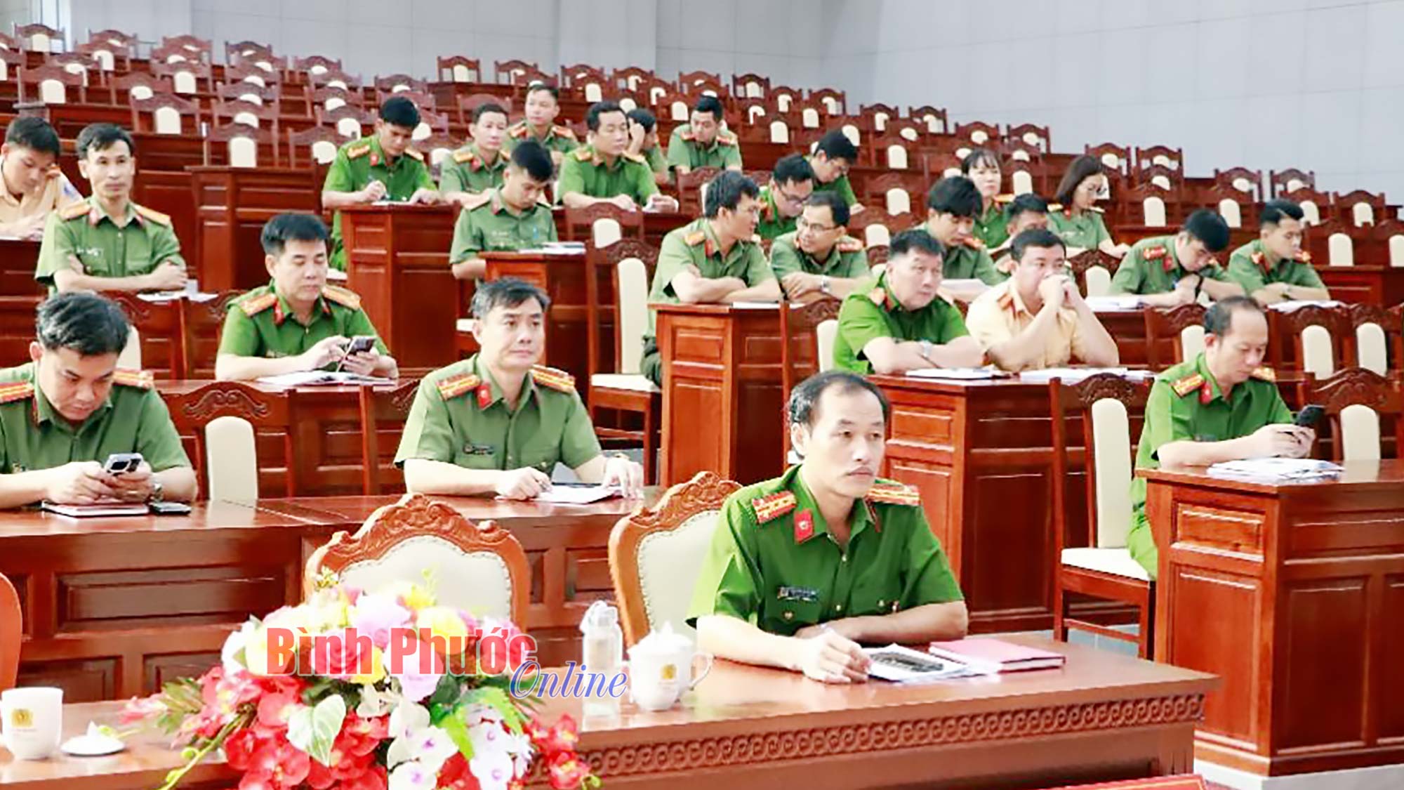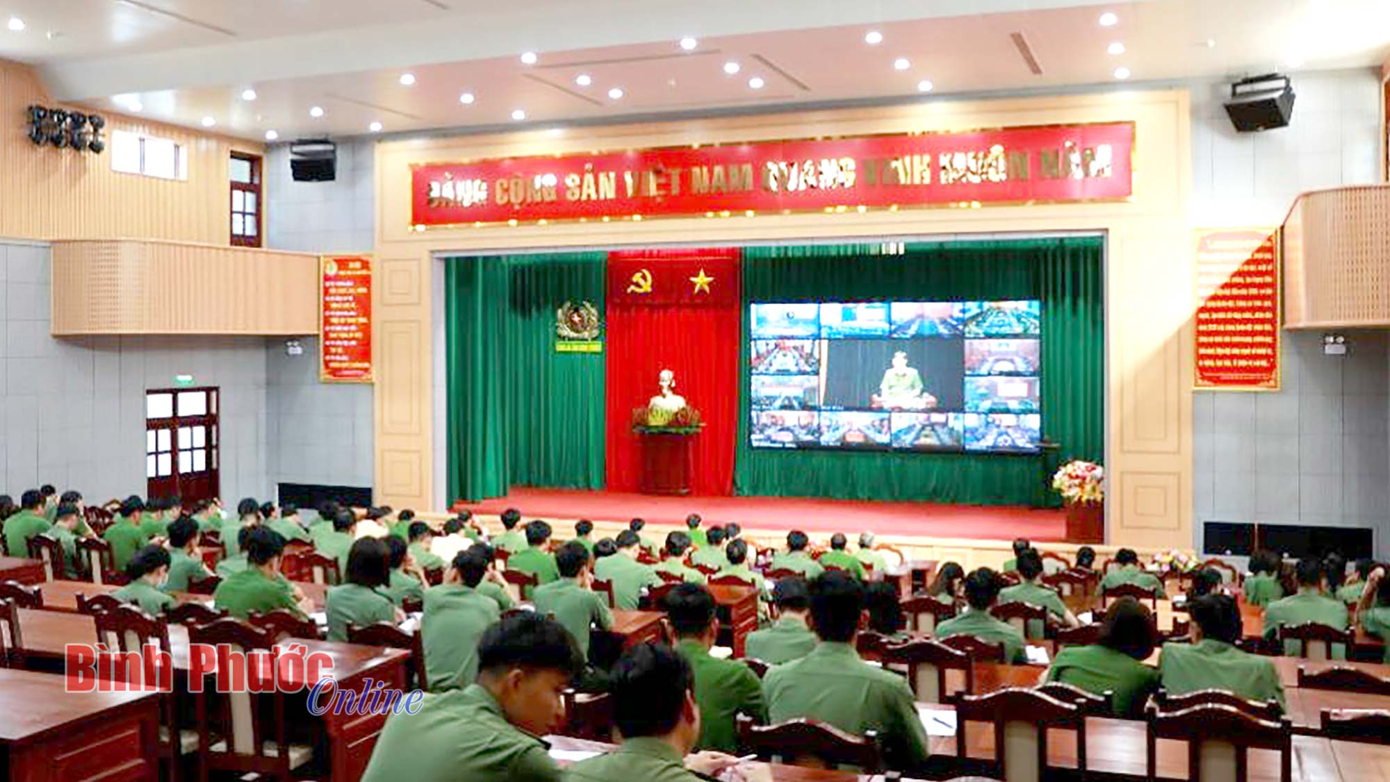 Đại tá Nguyễn Huy Hải, Ủy viên Ban Thường vụ Đảng ủy, Phó Giám đốc Công an tỉnh chủ trì cùng các cán bộ chủ chốt tham dự tại điểm cầu Công an tỉnh Bình Phước
