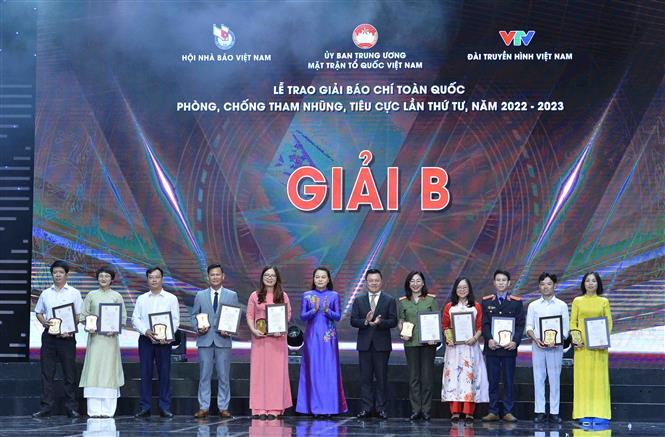 Phó Trưởng Ban Tuyên giáo Trung ương, Tổng biên tập Báo Nhân Dân, Chủ tịch Hội Nhà báo Việt Nam Lê Quốc Minh và Phó Chủ tịch, Tổng Thư ký Ủy ban Trung ương MTTQ Việt Nam Nguyễn Thị Thu Hà trao Giải B cho các tác giả. Ảnh: Minh Đức/TTXVN