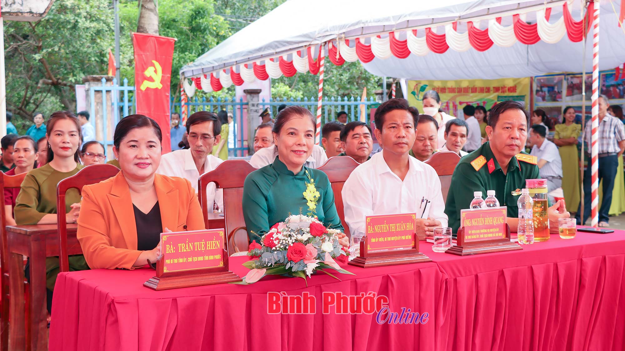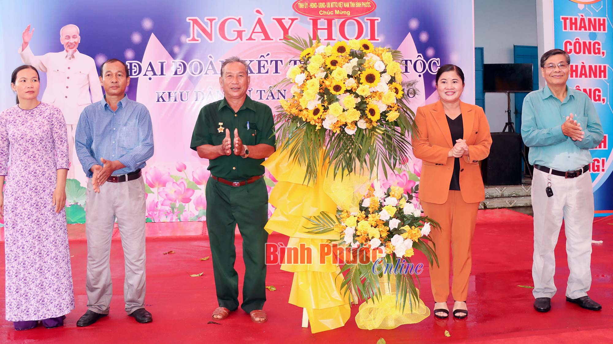 Phó Bí thư Tỉnh ủy, Chủ tịch UBND tỉnh Trần Tuệ Hiền và Phó Chủ tịch Ủy ban MTTQ VN tỉnh Nguyễn Thanh Bình tặng hoa chúc mừng ngày hội đại đoàn kết toàn dân tộc tại xã Bù Nho