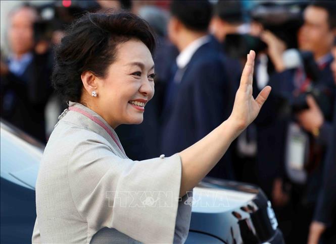 Giáo sư Bành Lệ Viên, Phu nhân Tổng Bí thư, Chủ tịch nước Trung Quốc Tập Cận Bình vẫy chào các đại biểu ra tiễn tại sân bay quốc tế Nội Bài. Ảnh: Phạm Kiên/TTXVN