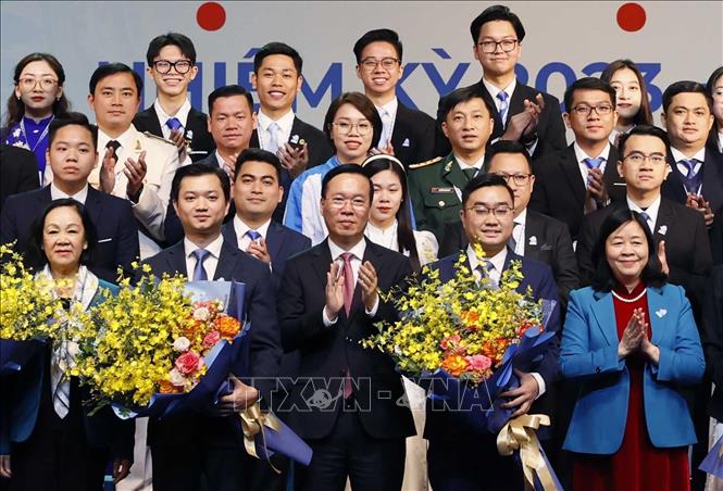 Chủ tịch nước Võ Văn Thưởng cùng các đồng chí lãnh đạo Đảng và Nhà nước chúc mừng Ban Chấp hành Hội Sinh viên Việt Nam khóa XI. Ảnh: Thống Nhất/TTXVN