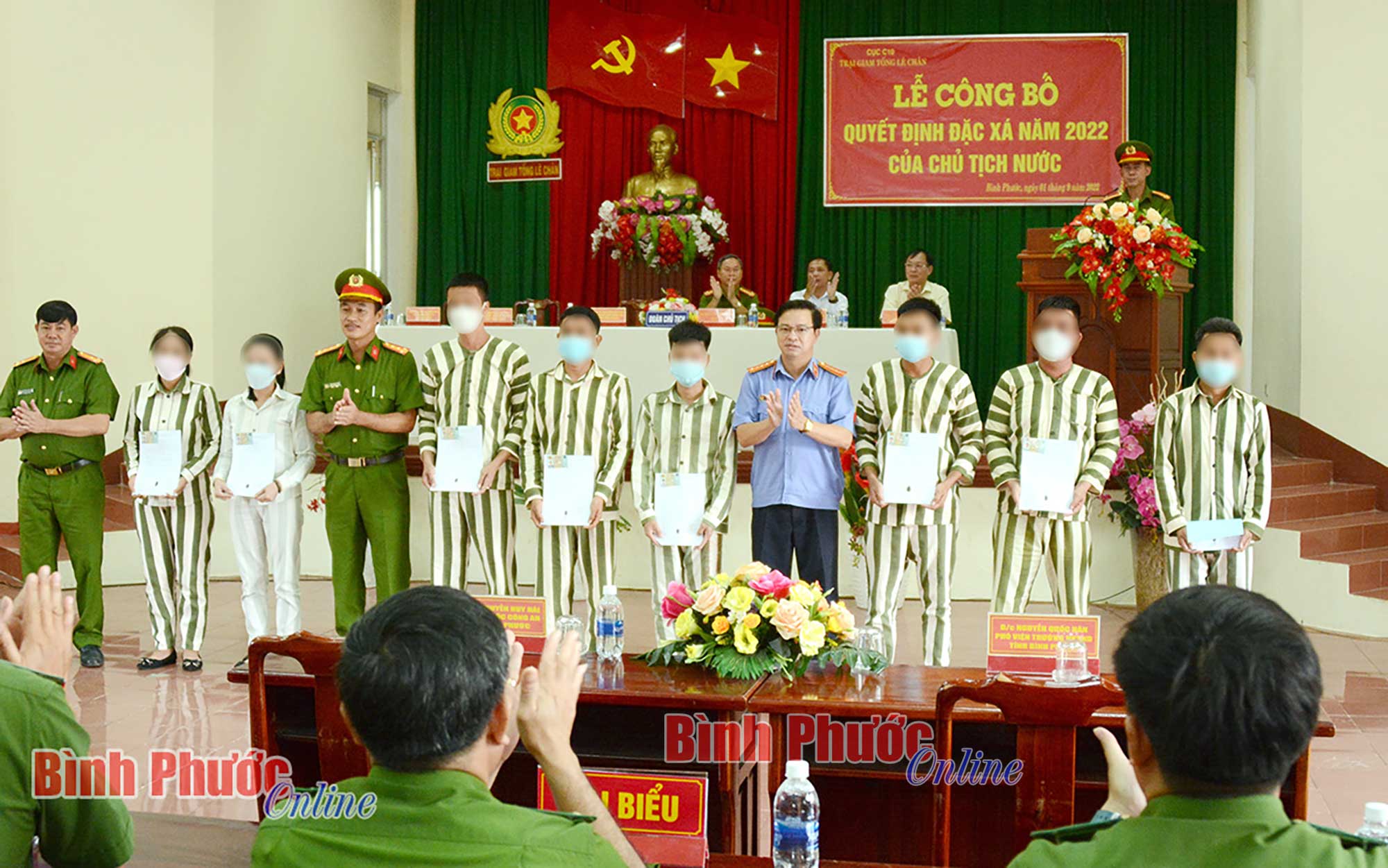 Lãnh đạo Công an, Viện kiểm sát nhân dân tỉnh Bình Phước và chính quyền địa phương trao quyết định đặc xá năm 2022 của Chủ tịch nước cho các phạm nhân tại Trại giam Tống Lê Chân (đóng chân trên địa bàn huyện Hớn Quản) - Ảnh: Quốc Việt
