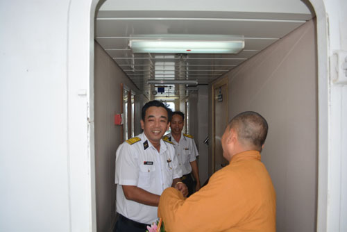 Suốt hành trình sóng gió của tàu HQ-571 ra các đảo thuộc Quần đảo Trường Sa, lính ta cứ đi qua Phòng B5 của tàu là nhẹ chân, rón rén nhìn tấm giấy dán ngoài cửa “Phòng hai sư thầy” rồi vụt qua, thì thầm bảo nhau: “Chuyến biển này cũng có hai nhà sư, ra… thay trụ trì ngoài Chùa Trường Sa Lớn”…