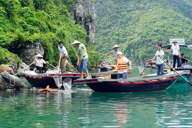 Cán bộ của tổ chức MCD thu gom rác trôi nổi trên một vùng biển thuộc vịnh Hạ Long (Quảng Ninh)
