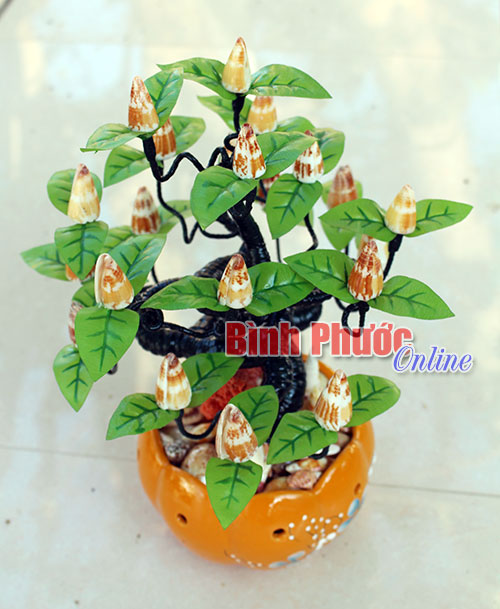 Không những hoàn thành xuất sắc nhiệm vụ bảo vệ vững chắc chủ quyền biển đảo của Tổ quốc, tích cực tăng gia sản xuất, nhiều cán bộ, chiến sĩ trên các đảo ở quần đảo Trường Sa còn tạo ra nhiều sản phẩm đặc sắc, độc đáo. Trong ảnh: Chậu hoa mai - cành làm bằng dây kẽm quấn vải ni-lon, lá cũng bằng vải ni-lon nhuộm màu và hoa là một loại ốc sẵn có ở biển Trường Sa.
