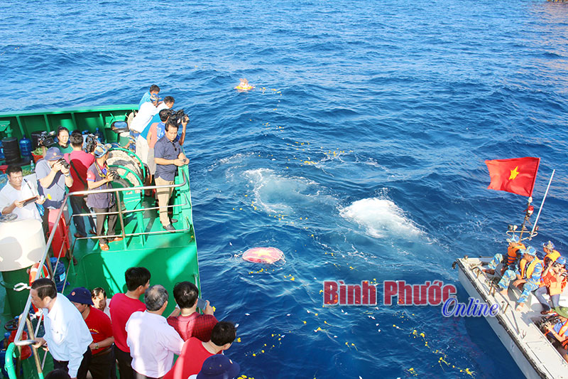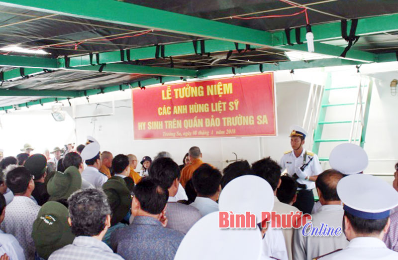 Trong không khí trang nghiêm, xúc động, với lòng thành kính tri ân, đoàn công tác đã thắp nén tâm nhang, thả vòng hoa tưởng niệm các anh hùng liệt sĩ. Tháp tùng cùng đoàn cán bộ của Bình Phước cùng các tỉnh: An Giang, Tây Ninh, Bình Dương, Vĩnh Phúc, Khánh Hòa trong hải trình lần thứ 4 năm 2018 ra thăm quân và dân Trường Sa, phóng viên Báo Bình Phước đã ghi lại những hình ảnh vô cùng xúc động trên con tàu 561.