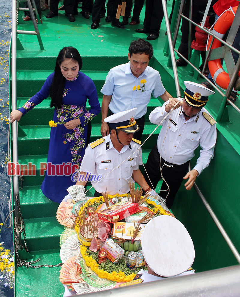Sau lễ tưởng niệm, các đồng chí: Chuẩn đô đốc Phạm Xuân Điệp, Phó tư lệnh Quân chủng hải quân, trưởng đoàn công tác; Hoàng Thị Thúy Lan, Ủy viên Ban Chấp hành Trung ương Đảng, Bí thư Tỉnh ủy Vĩnh Phúc; Trần Lưu Quang, Ủy viên Ban Chấp hành Trung ương Đảng, Bí thư Tỉnh ủy Tây Ninh đưa lễ vật từ boong tàu để thả xuống biển.