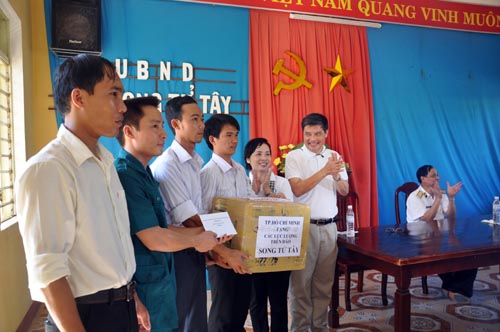 Đồng chí Nguyễn Văn Đua, Phó Bí thư Thành ủy TP.HCM tặng quà cho UBND xã đảo Song Tử Tây. |
