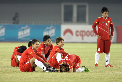 Nỗi buồn thua trận của các cầu thủ nữ Myanmar - Ảnh: N.K