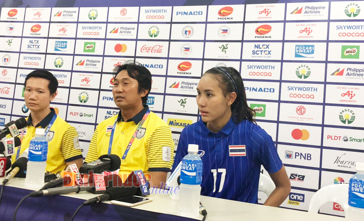 Ban huấn luyện và nữ cầu thủ Thái Lan trả lời họp báo sau trận đấu - Ảnh: Hưng Cát