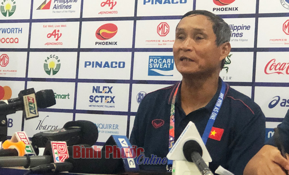 HLV Mai Đức Chung của đội tuyển nữ Việt Nam trả lời họp báo sau trận đấu - Ảnh: Hưng Cát
