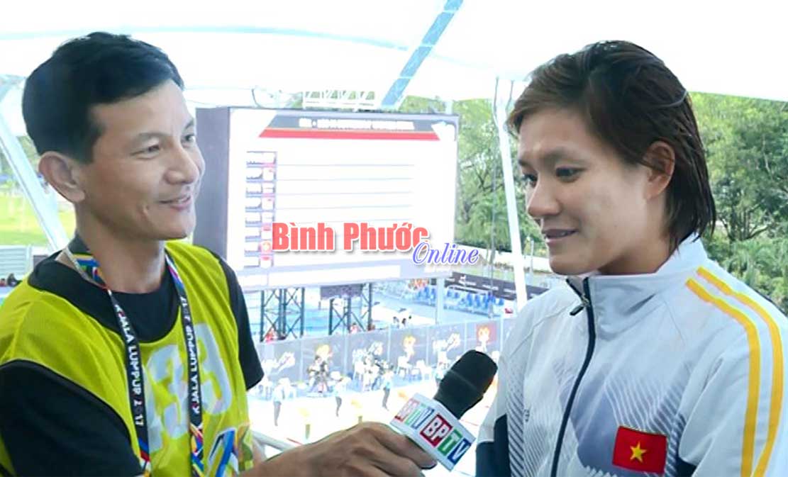 Kình ngư Lê Thị Mỹ Thảo trả lời phỏng vấn phóng viên Đài Phát thanh - Truyền hình và Báo Bình Phước