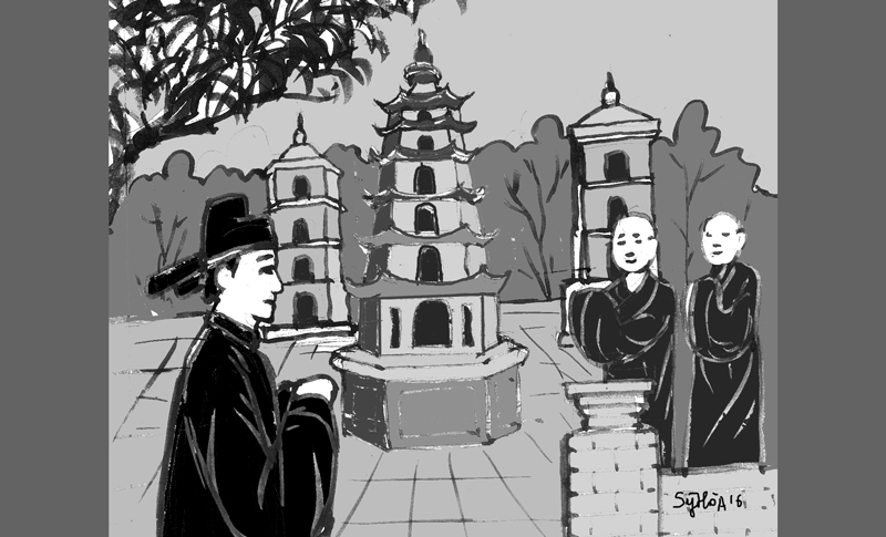 Chiều hôm ấy, cụ Lê Hữu Kiều khi đi du ngoạn quanh vùng thì gặp một ngôi chùa cổ có phong cảnh rất u tịch nên tò mò muốn ghé vào thăm. Khi vào đến nơi, cụ thấy không gian nơi đây thoáng đãng, cây cỏ bát ngát, cửa thiền lộng lẫy, nguy nga. Vị sư trụ trì chùa này cùng đoàn chư tăng đón tiếp cụ rất thành kính và chu đáo. Khi đi tham quan xung quanh ngôi chùa, nhìn thấy mọi nơi đều sạch sẽ phong quang và ngăn nắp, cây cảnh, dò lan, khóm trúc đều như mới được chăm sóc, cắt tỉa thì cụ Kiều tỏ ra rất thích thú và ngỏ lời khen ngợi.