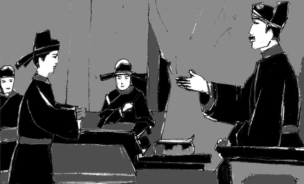 Hồng Vũ làm ra vẻ cảm thông và nhắc đi nhắc lại mấy lời: Thương thay! Thương thay! Rồi quay sang hỏi hai ban văn võ: Các khanh bàn xem việc này nên như thế nào. Liệu viếng thì có phạm vào điều lệ thiên triều hay không?
