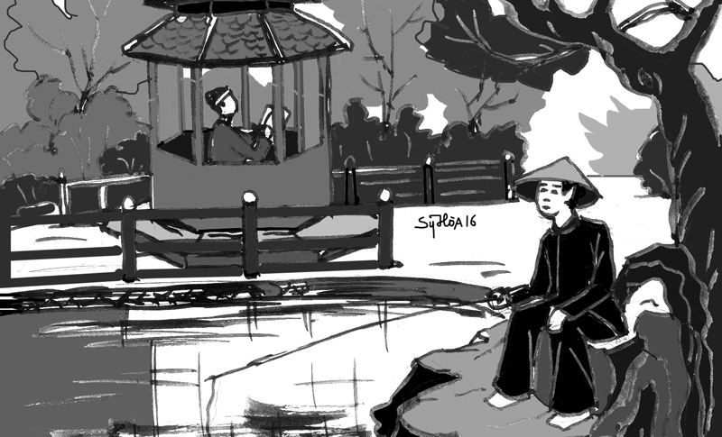 Ban đầu, vua - tôi đàm luận với nhau về thơ văn, rồi dần dần bàn đến thời thế, đến khả năng một cuộc khởi nghĩa chống Pháp cứu nước. Trần Cao Vân muốn nhờ vua dò xem ý tứ của Nguyễn Hữu Bài là tên quan thượng thư có thế lực lúc bấy giờ. Muốn công việc khỏi bị bại lộ, Trần Cao Vân đọc cho vua một vế đối thác lời vua để thử Nguyễn Hữu Bài. Vế đối rằng: Ngồi trên nước khôn toan việc nước, trót buông câu sở dĩ phải lần.