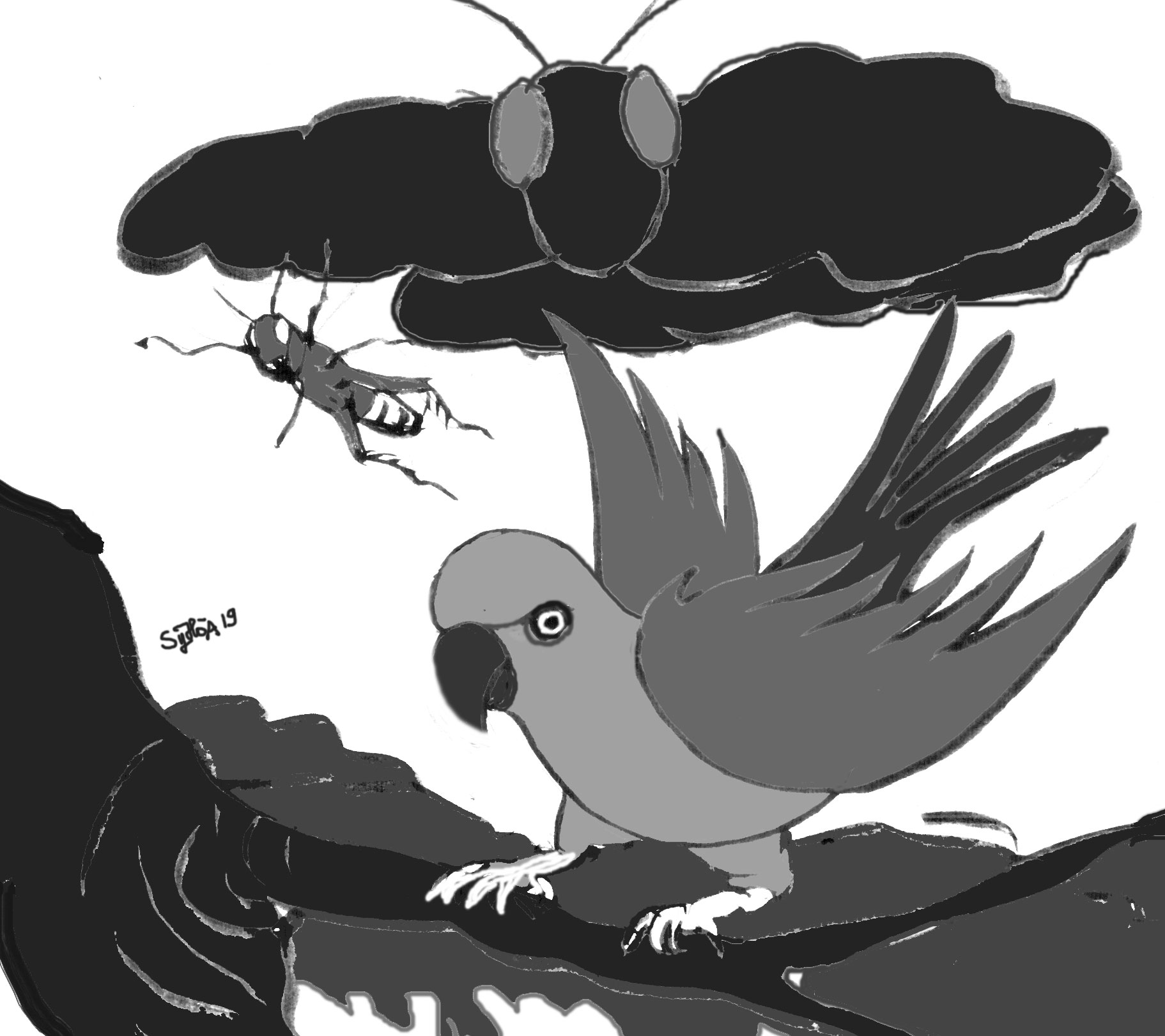 Lúc đó, vẹt Khoa La thấy phía trước hình như có một đám mây lớn đang bay lại. Đợi đám mây đó đến gần, vẹt Khoa La nhìn kỹ hóa ra đám mây là do rất nhiều con vật tạo thành. Đang buồn bực thì đám con vật kia bay tới, con thì đánh, con thì đạp, con thì đẩy, con thì cắn khiến vẹt ta vừa đau vừa ngứa không thể chịu nổi. Rồi bỗng dưng vẹt Khoa La kinh ngạc kêu lên: A! Trời ơi, đó là một đàn châu chấu. Đúng vậy, đàn châu chấu đông đúc bao vây vẹt Khoa La làm nó lóng ngóng và sợ hãi.